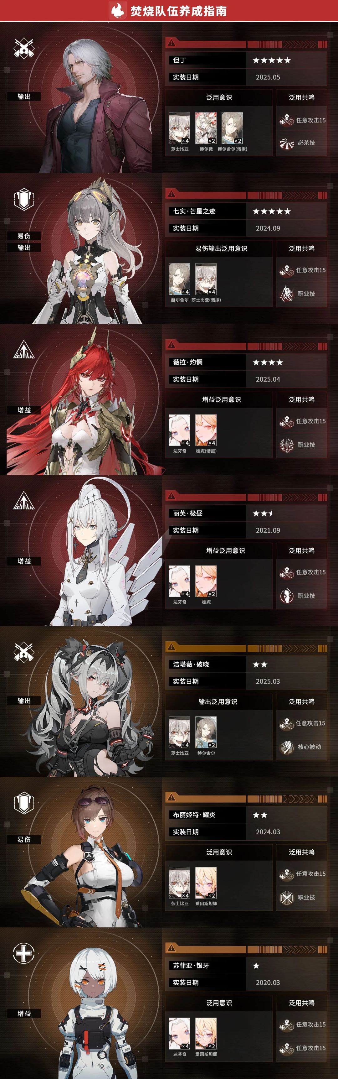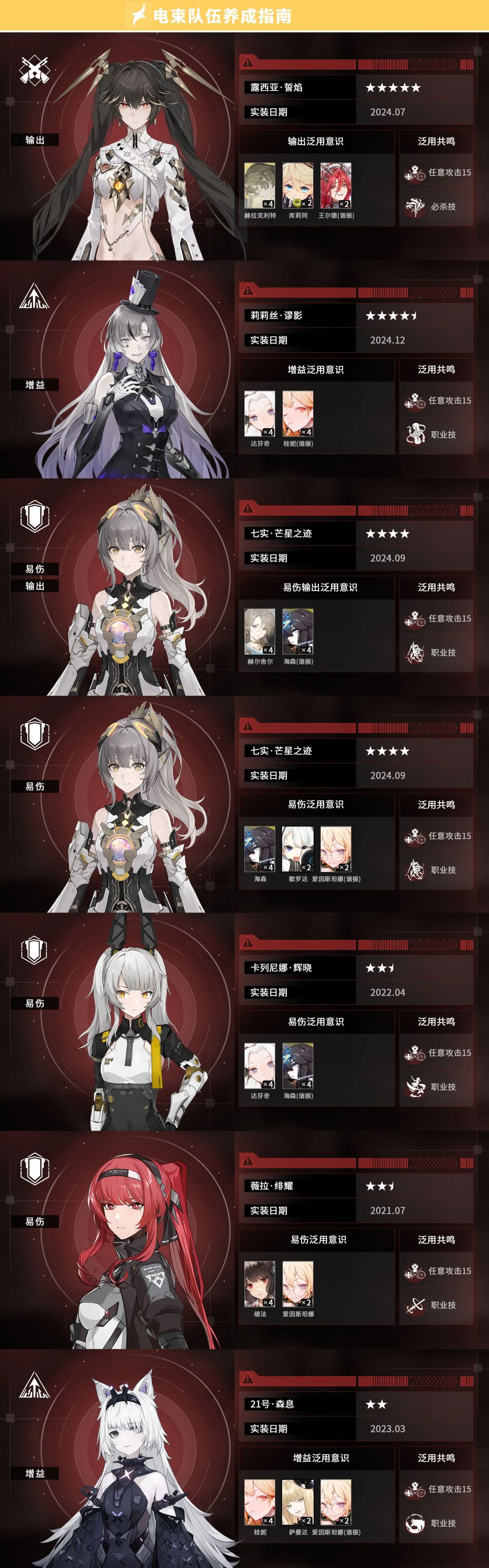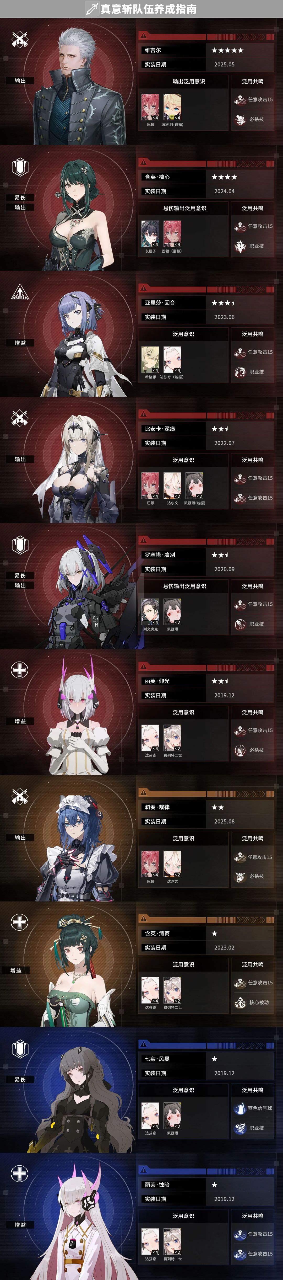 2.仅毕业阵容中的角色(或对于主要受众而言可进入毕业阵容中的角色),在该角色的多种思路完全不可能调和的情况下,考虑根据输出、易伤、增幅的不同功能为每个功能推荐至多1套方案。