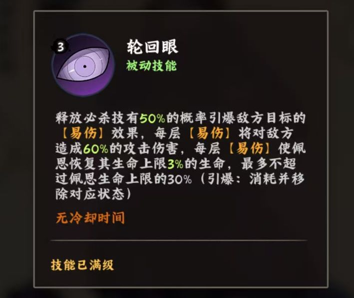 佩恩特色技能是轮回眼,对方每个【易伤】debuff都有50%概率被引爆,引爆直接交60%攻击力伤害。