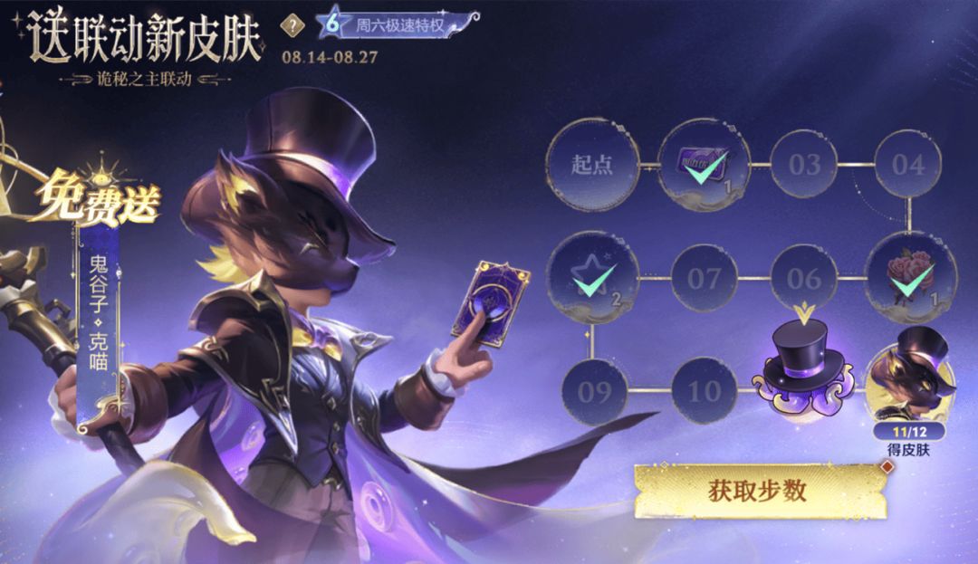 5款《诡秘之主》联动皮肤,限定传说的大司命死亡执政官,限定史诗的弈星守夜人在8月14日已经以990、490点券的超值礼包形式上架,而现在8月18日,只要前面几天每天都有完成送联动皮肤活动页面的对局和登录任务,那就可以领取鬼谷子的限定勇者皮肤克喵,还没达到领取要求的小伙伴也不要急,活动要到8月27日才结束,而该活动最快5天就可以领取皮肤。