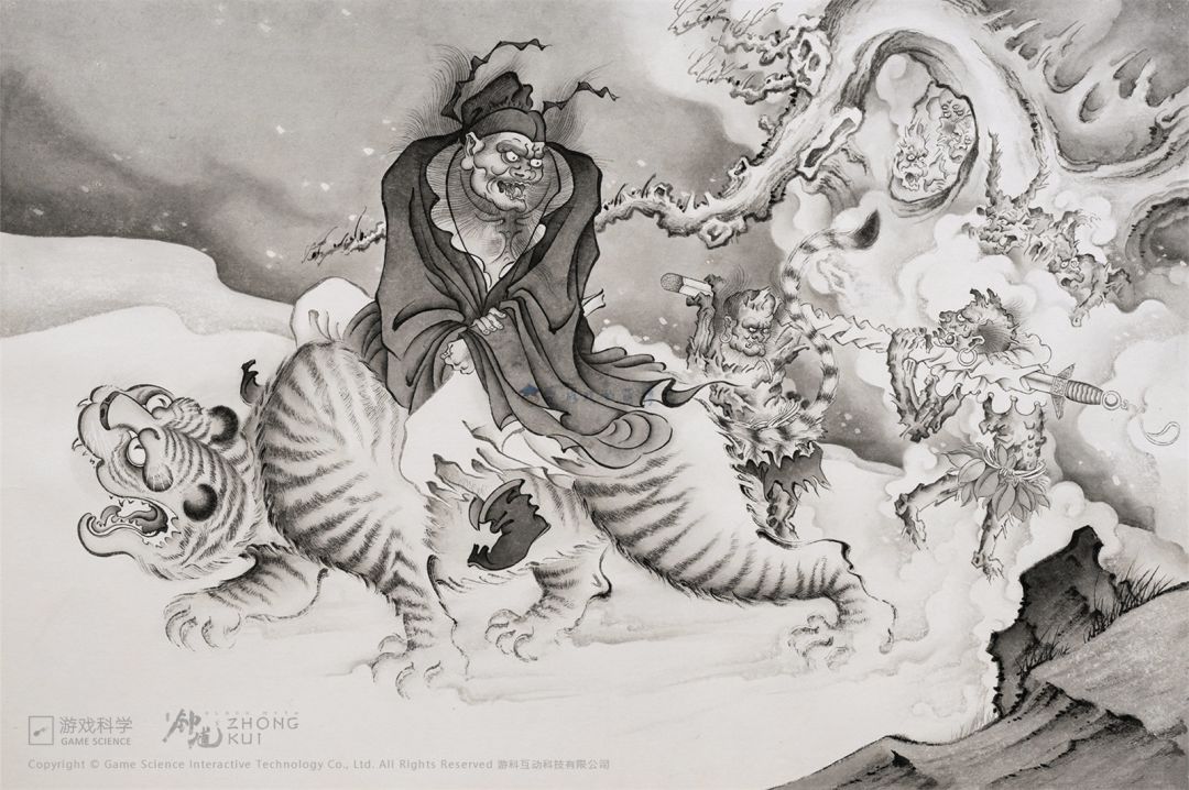 杨奇坦言,在他以往的认知中,钟馗并没有骑老虎的形象。但出于对梦境细节的好奇,他查阅了大量资料,惊喜地发现:在明代的画作中,钟馗骑虎的形象其实并不少见。这一意外的发现,让杨奇更加坚定了将钟馗作为新作品主角的想法。他认为,“机缘”对于创作者而言至关重要。游戏科学的这群老战友们,从腾讯时期的《斗战神》开始,钻研西游题材已经长达10多年。在《黑神话:悟空》成功推出后,是时候迎接新的挑战,开拓新的创作天地了。杨奇觉得,神魔故事固然引人入胜,但志怪传奇同样有着独特的魅力,值得深入挖掘。