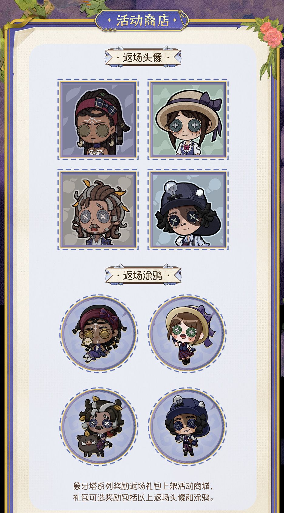 访客们完成指定任务即可获得活动头像、活动涂鸦等奖励。象牙塔系列时装上新、返场以及往期象牙塔系列道具返场也将同步开启。
