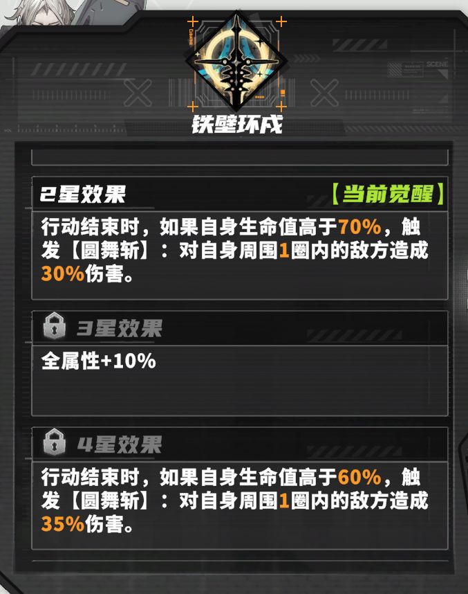 具体的技能介绍在游戏中【招募——详情】界面都可以查看,我就不多此一举把图贴出来了。唯一需要的贴图可能是这个角色的天赋,因为详情页面只能看到六星天赋。所以四星天赋如下图。