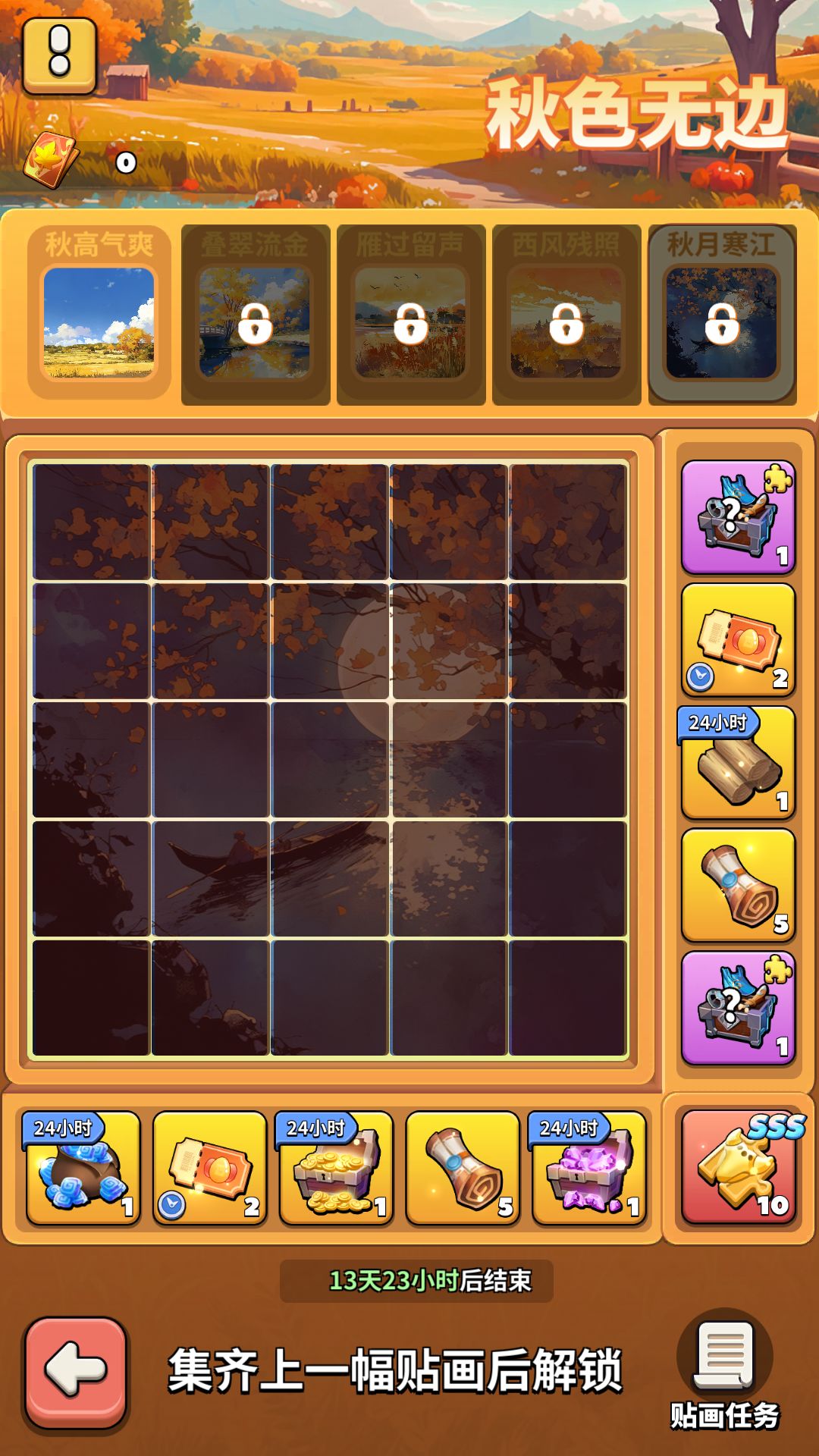 2. 活动期间,可从多种途径获取秋色画片。3. 消耗秋色画片可随机激活1格,集齐一整行或一整列即可领取对应奖励。4. 集齐一整幅贴画,可领取最大奖励。5. 累计贴画达到指定次数,可领取贴画任务奖励。6. 活动结束后,剩余画片道具可在背包内回收。