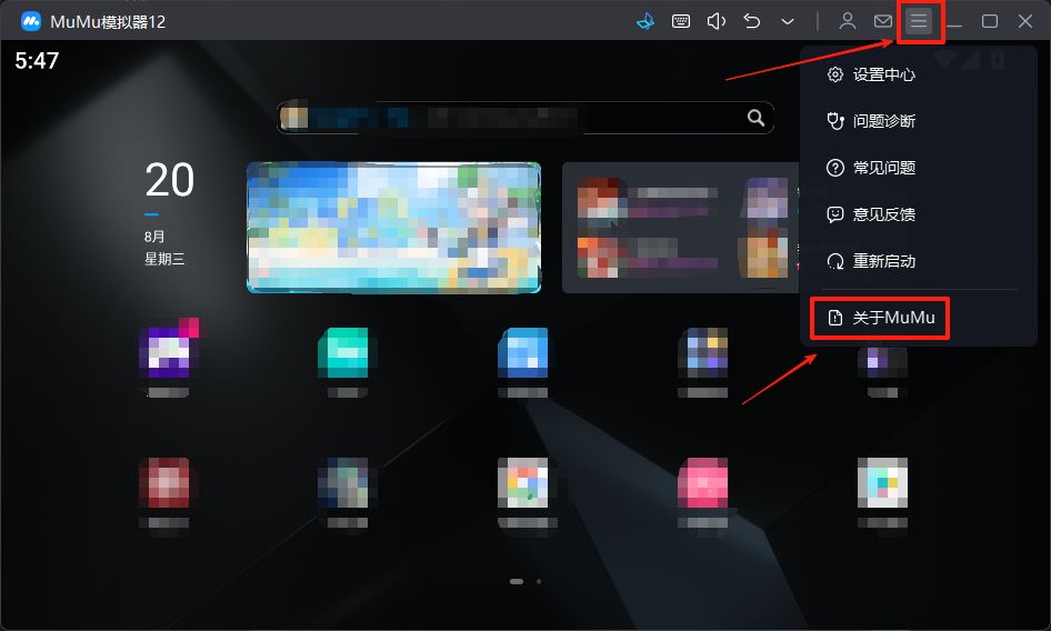 第一步:检查模拟器版本是否为最新(点击左上角三条杠,选择关于MuMu)