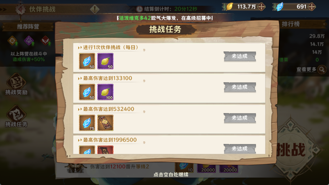 每日挑战伙伴,可根据单次造成伤害最高数值领取10-200钻石,努力培养队伍带出高额伤害呀~