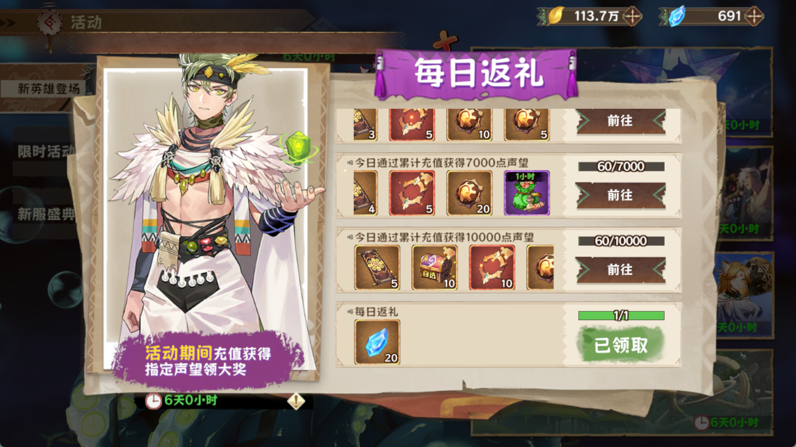 每日返礼可获得20钻石