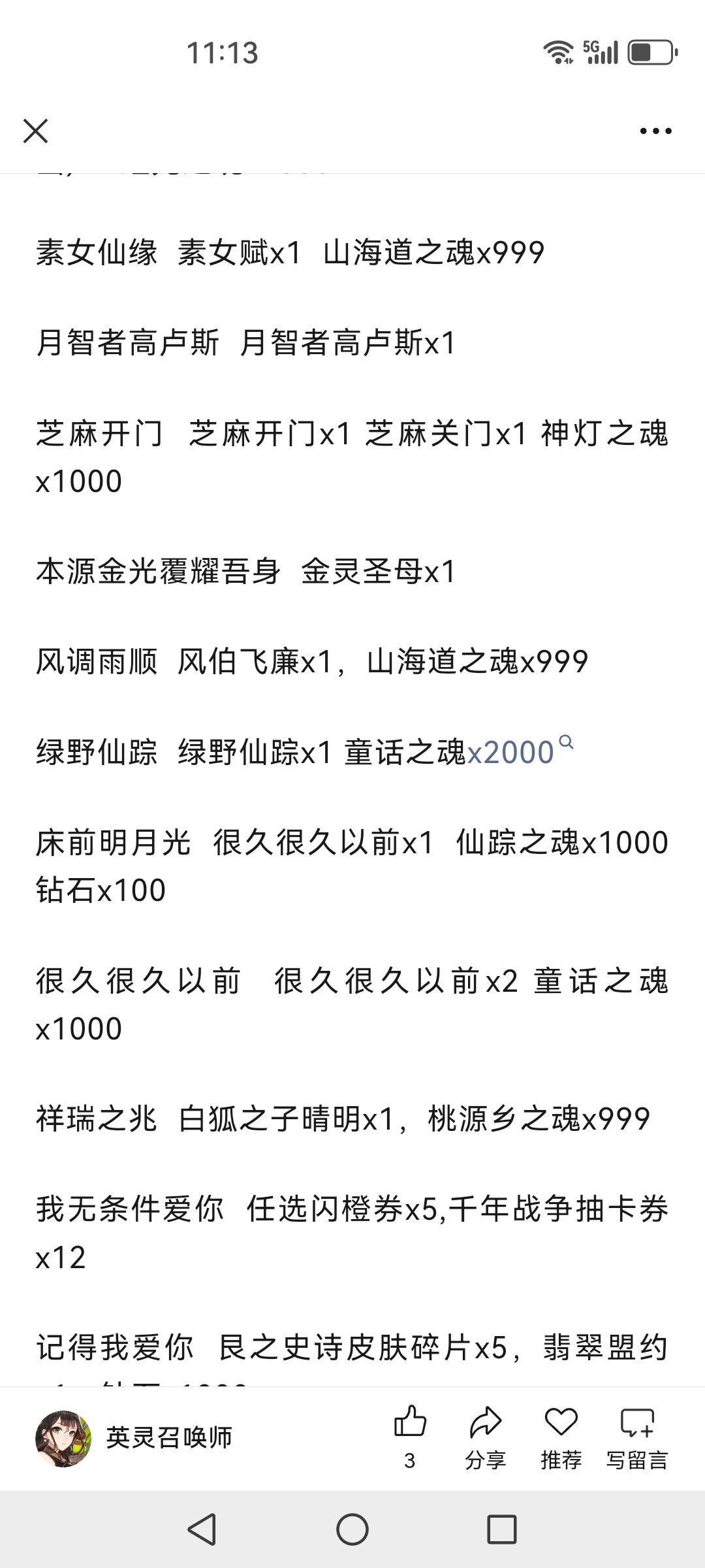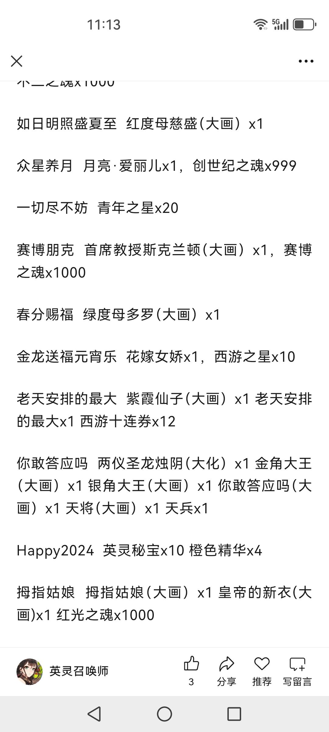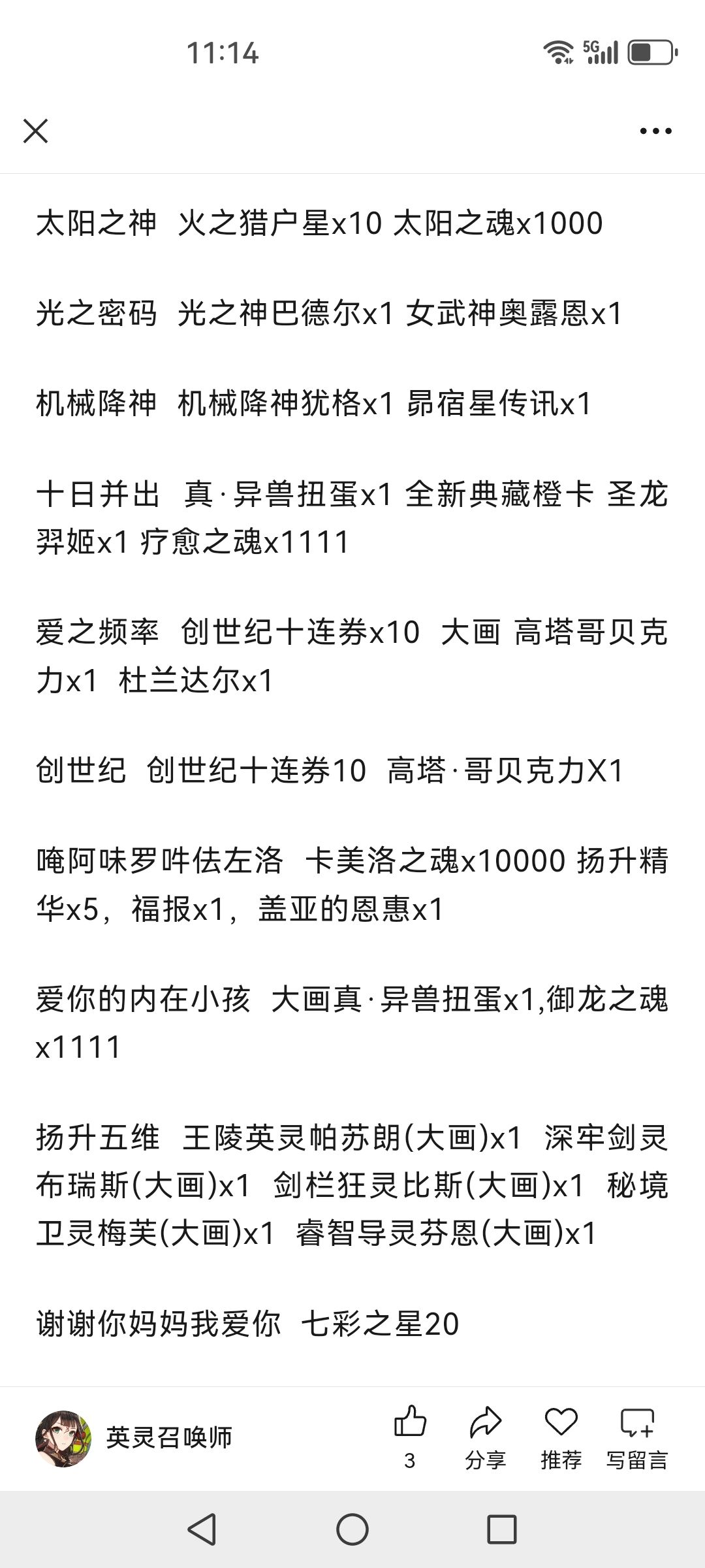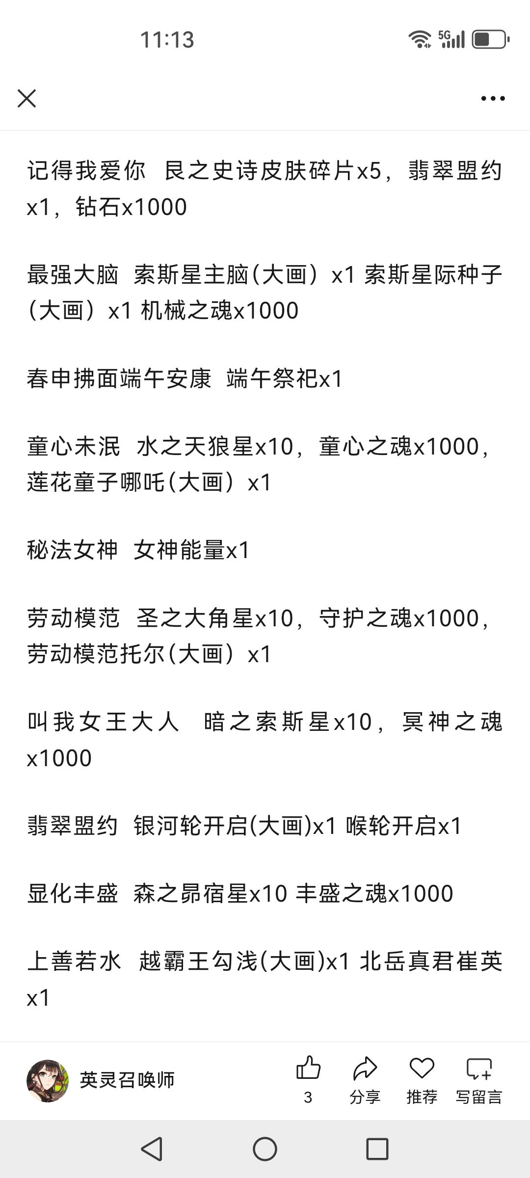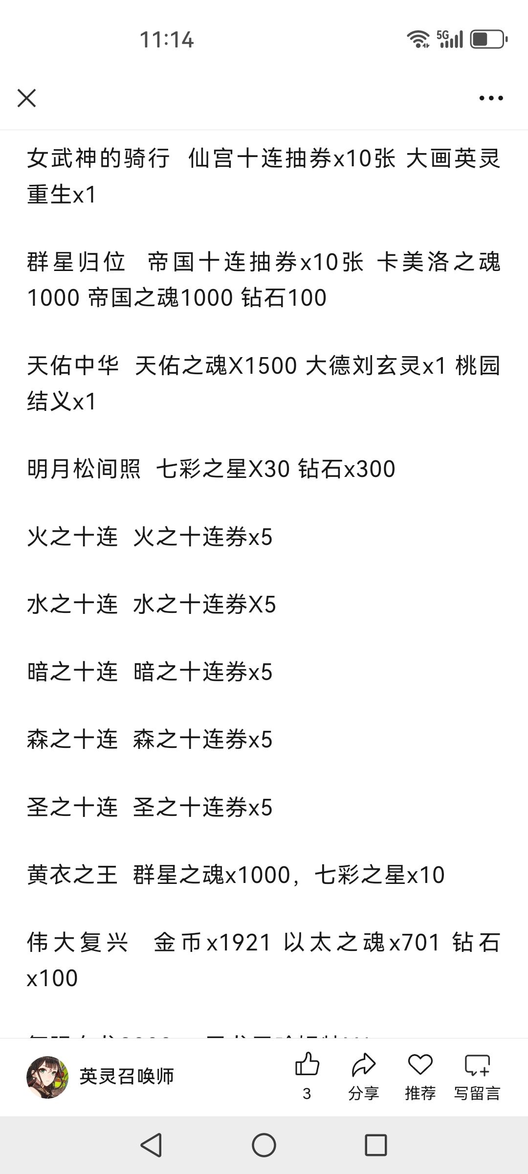 火把燎原佑千秋 弑神者阿体拉巴x1星门执法者 星门执法者奥罗拉x1水利万物 地神女娲x1,水神之魂x1000 守护天使泰拉 守护天使泰拉x1 千年战争十连券x20父立乾道子蕴坤德 混天大圣鹏小小x1天贶赐福日佑苍生 东胜龙脉x1端午纳吉 九歌礼魂屈原x1,虹彩之魂x1000我看见的未来 森语者丹玛斯x1,帝国之魂x1000自做自得心想事成 显化之星2025x10森之觉醒 森之觉醒精华x5