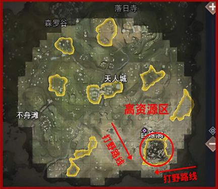 开局选择出生点时,黄色区域为高资源区,高资源区内物堆会更多,但相应的竞争也会更加激烈。喜欢打架的朋友可以选择地图中心天人城,新手玩家也可以选择在周边地区打野,一圈搜下来装备未必会比高资源区域差。