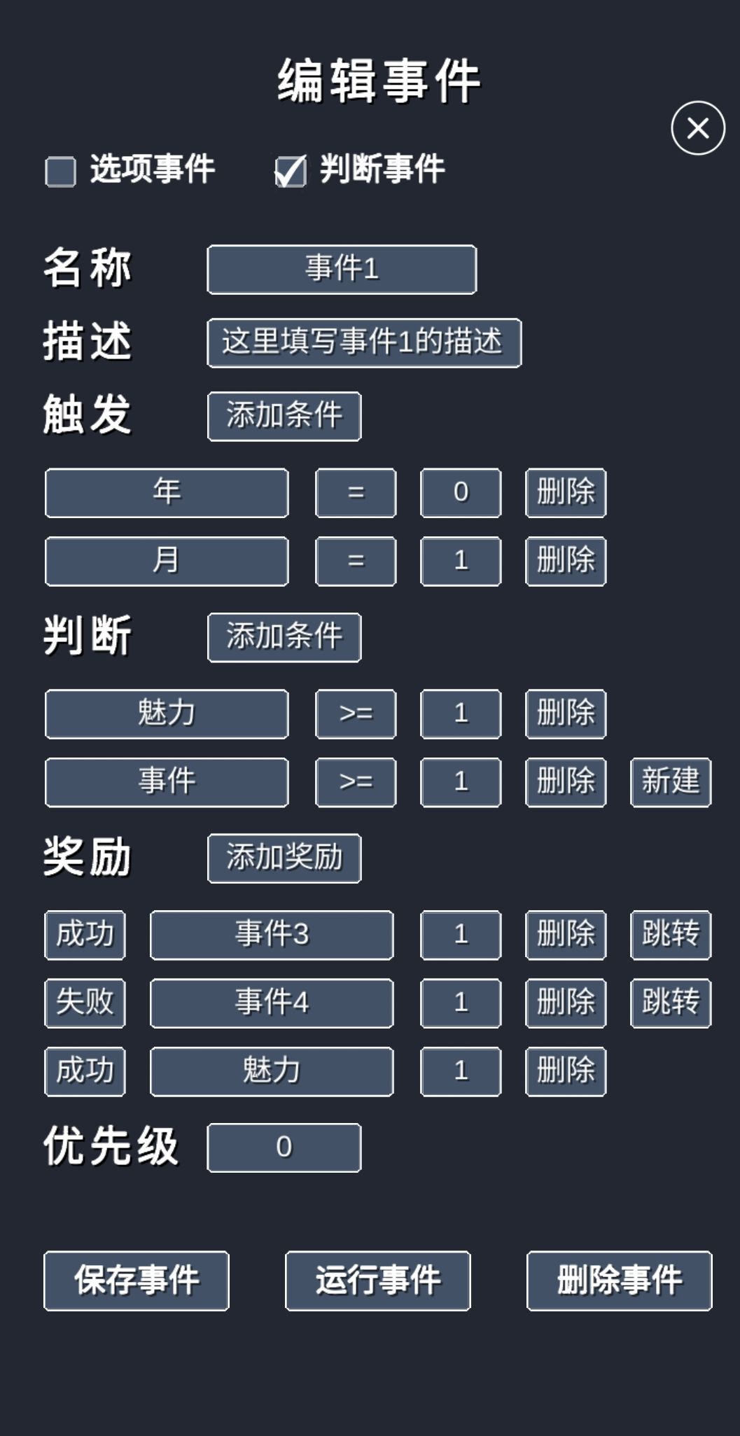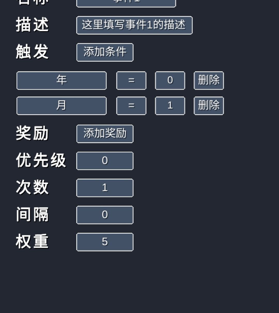 下面继续介绍事件系统,介绍其他一些属性的意义和操作。1)优先级。优先级是指一个回合内事件发生的优先级,它的取值是零到正无穷,可以任意设置。这里,一个回合是指在这一年或者这一月所有可能发生的事情(...