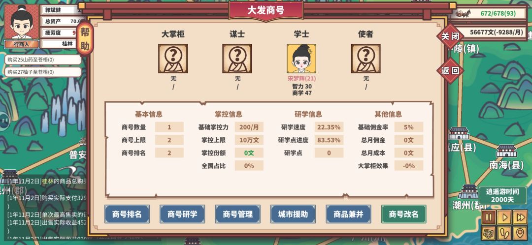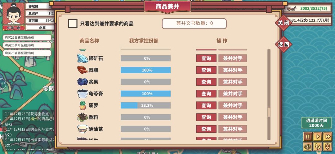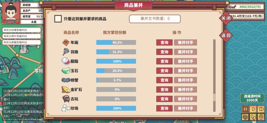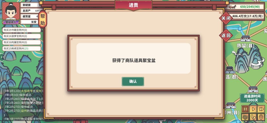 5.规划好掌控城市,想短时间掌控最大份额就选只有两个城产出的商品城市,比如珍珠胭脂,利用进贡的兼并比只刷单个州府要划算