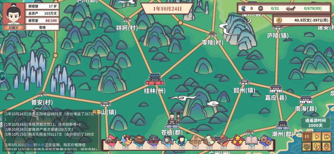 到宜山刷苹果的任务,刷完开柚子刷象郡柚子任务,开了山药就可以象郡苍梧来回刷,中间西南贡献到100攒到钱就去桂林拿背篓,招州府的人,把学者换成30+的,研究只点宣传,苍梧刷就开郡府宣传,四五个月就可以升级,用苍梧的商品把桂林广州的贡献刷到48,两个州府来回跑,资产刷到700万左右,三年10月之前带上进贡的商品,其他的带椰子去进贡