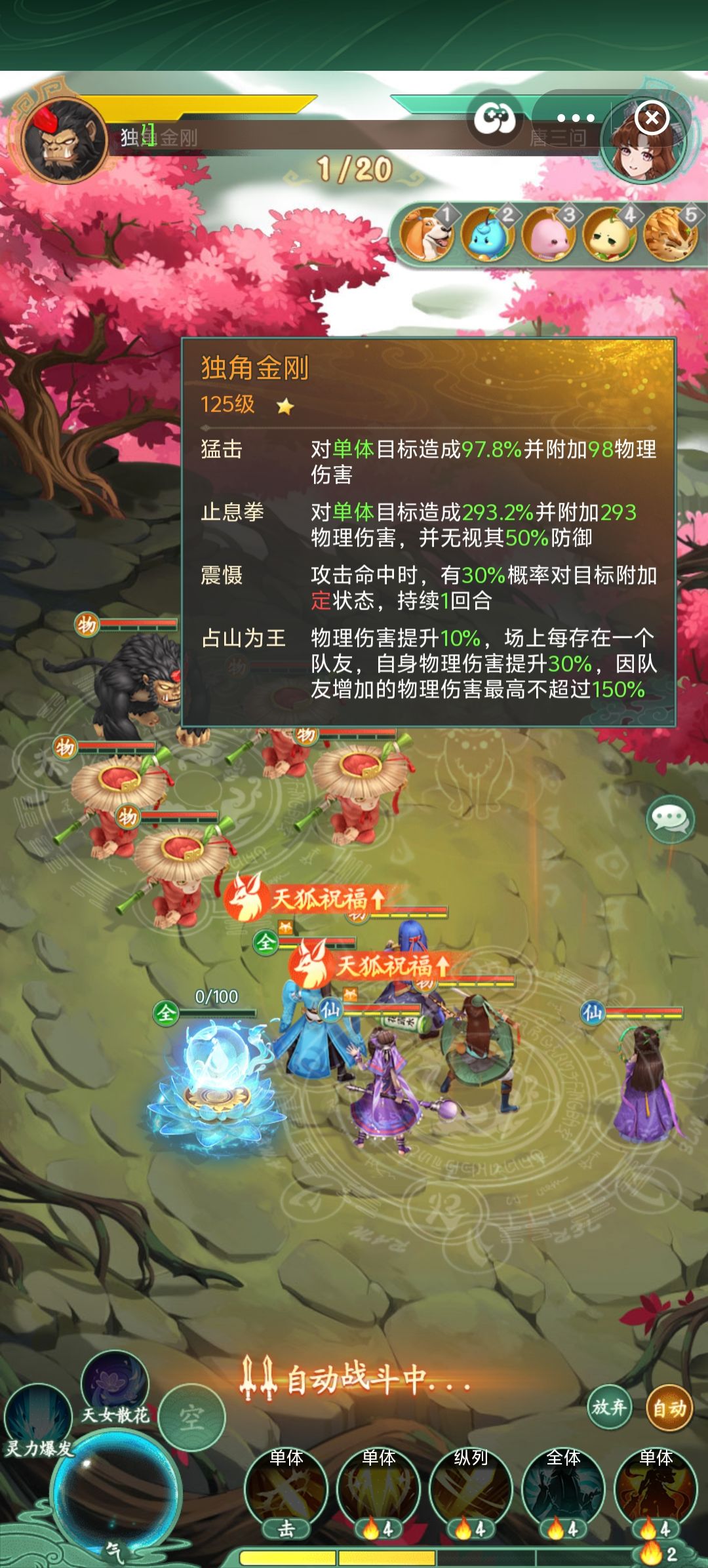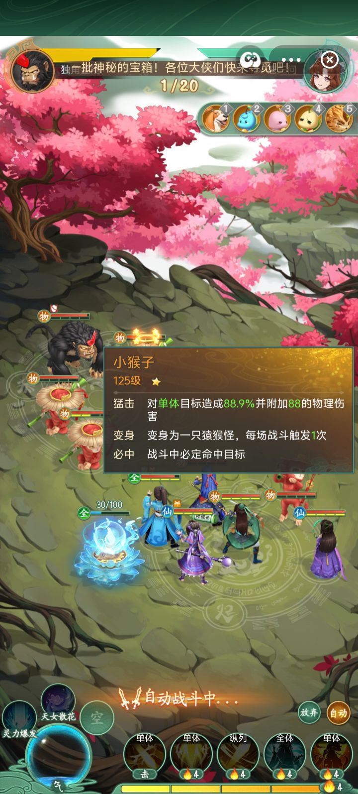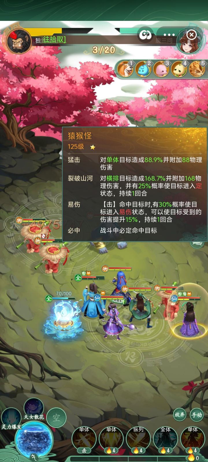 打法:第一回合在金刚出手前要利用酒的双爆干掉它,因为金刚伤害特别高,如果没成功,马上放弃重来,利用大黄,紫萱,武神减少猴子变身时间及出手次数,变身后的猴子攻击和防御都大大提升,梦璃扛的时间越长胜率越高,多带防御类的蛊。