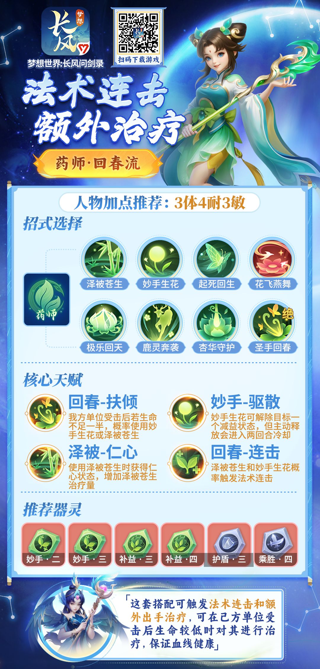 在《梦想世界:长风问剑录》中,有六大门派与十二条专精路线,搭配丰富多彩的法宝器灵与超多分支的天赋树,衍生出百花齐放的流派,帮助少侠应对多种不同场景。本期给大家带来药师流派的一图流分享,希望能帮助刚接触药师的少侠在江湖路上走得更轻松。江湖无定式,万法皆自然,期待各位少侠在评论区分享你的心得和搭配。