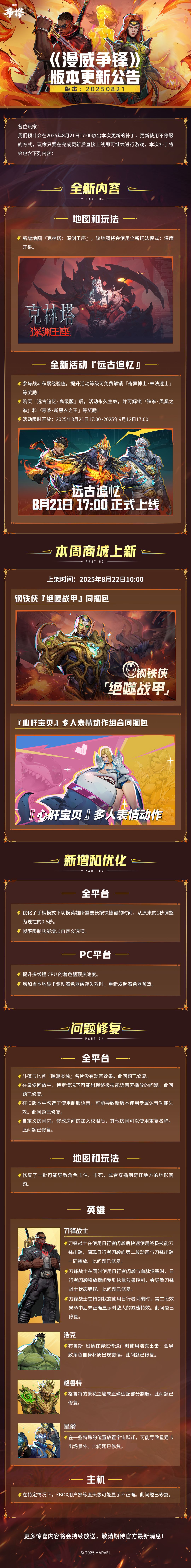 我们预计会在2025年8月21日17:00放出本次更新的补丁,更新使用不停服的方式,玩家只要在完成更新后直接上线即可继续进行游戏,本次补丁将会包含下列内容: