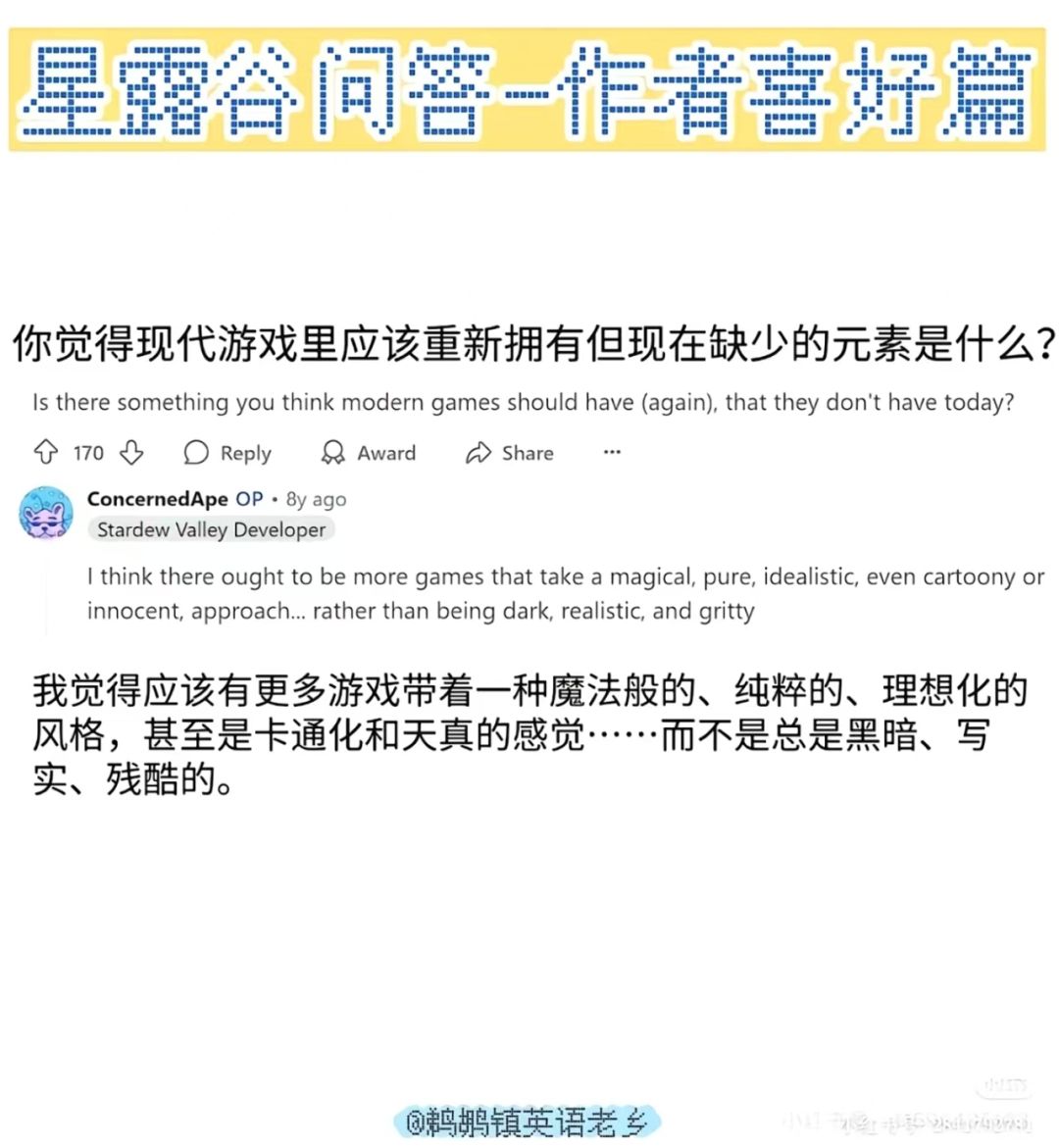 星露谷作者曾经回答过玩家的问题:“你觉得现代游戏里应该重新拥有但现在缺少的元素是什么?