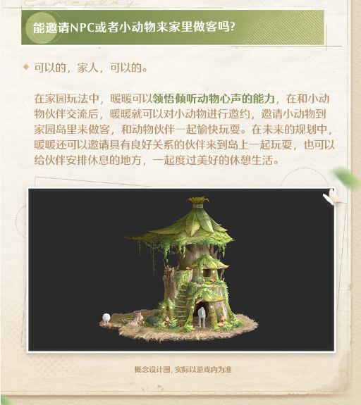 1.9版本即将更新的家园可以种植、养鱼、制作、建造家园和不同能力融合玩法,不仅如此,家园还可以邀请NPC或者小动物来到我们的家里做客,还可以领悟倾听动物心声的能力,这一看就联动合理性出来了。