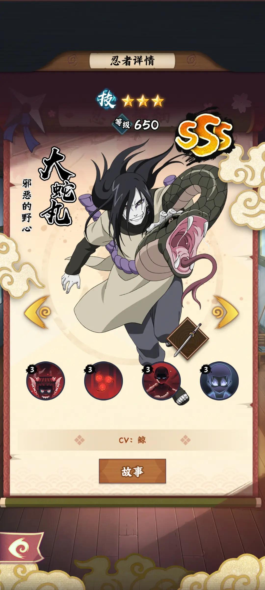 哈喽各位小伙伴,我是你们的老朋友山月明悟!今天给大家介绍的是老角色sss忍者「大蛇丸大招是[三重罗生门]」正式介绍!蛇叔作为传说中的三忍之一,掌握核心科技、咒印、不死转生,这一次带着草薙剑与三重罗生门强势归来,直接把“打不死”写进了技能组。废话不多说,山月直接上硬菜!