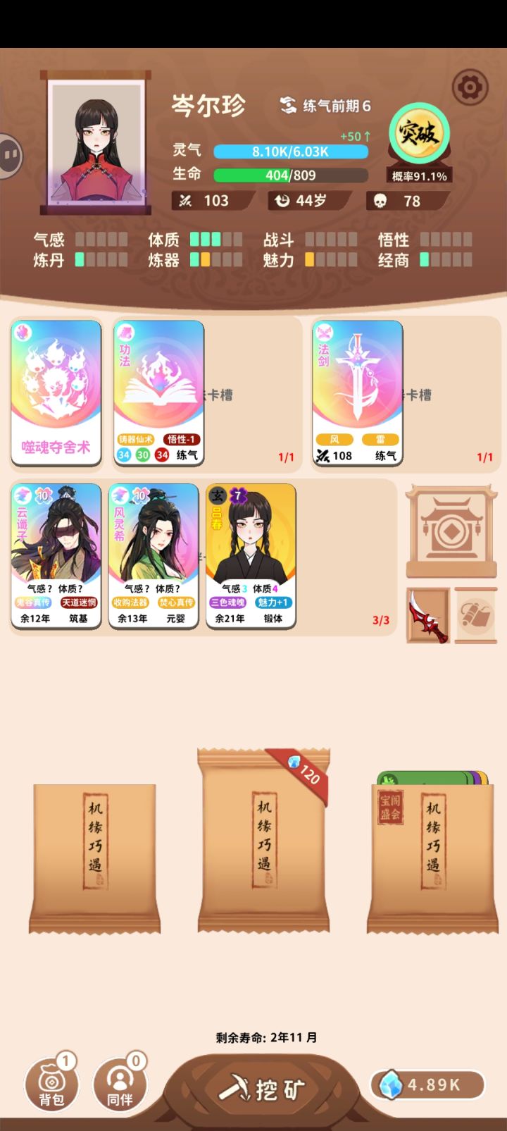 图三是游戏页面(需要的矿物靠挖矿获得,点一下耗费一月时间,一卡包5张卡)每张传承卡获得的效果也不一样(玩的时候也要注意右上角的突破键)