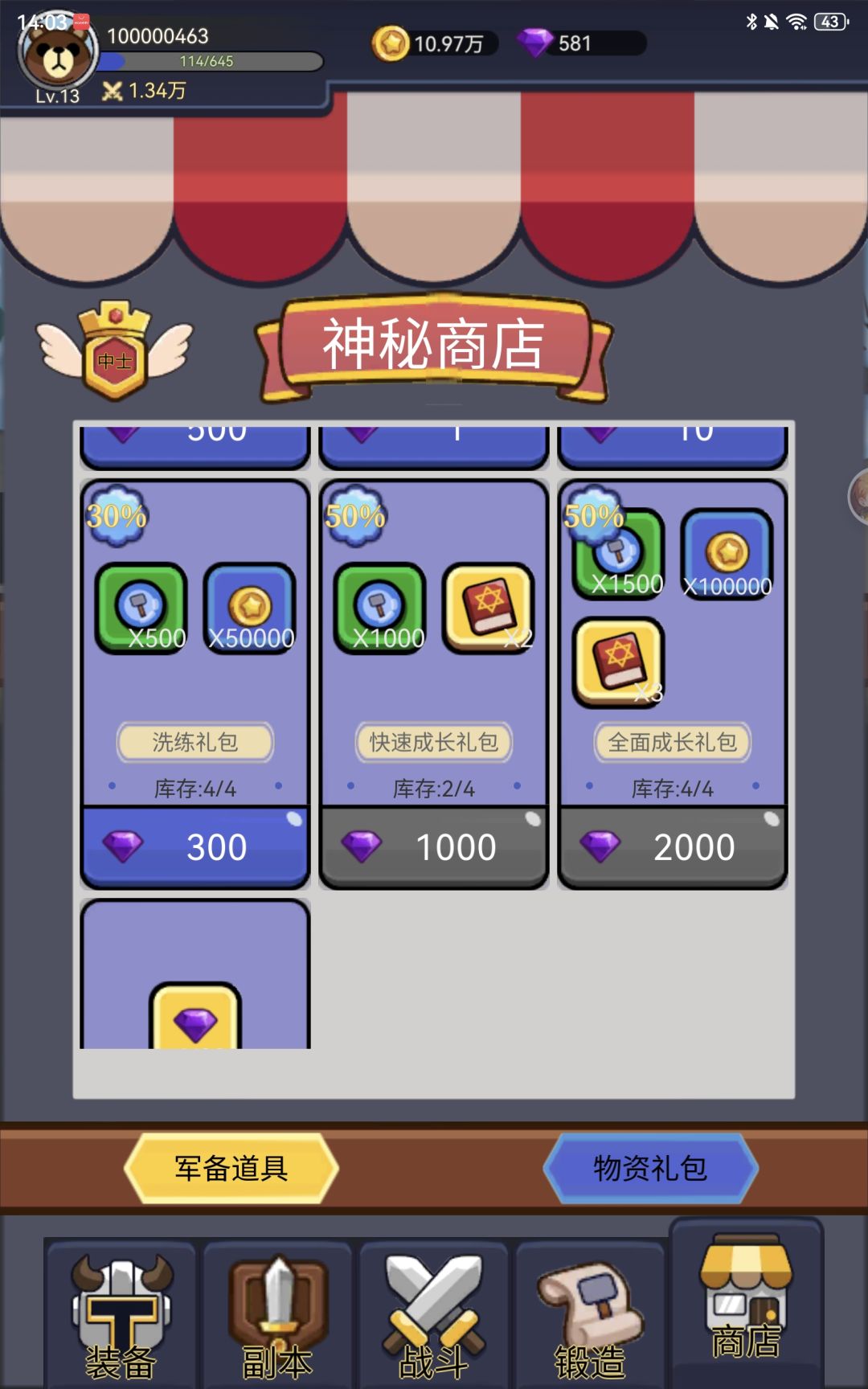 3.前期卡关可以去商店用金币买装备,商店里面的物资礼包只买1000的。再打不过我去打副本,副本失败不会减次数可以多试几次,7500战力可以稳过副本难度一。副本爆的三件紫装对前期还是很重要的。