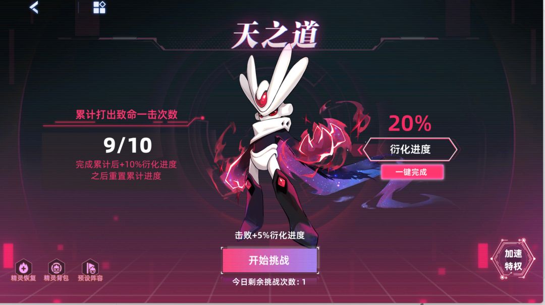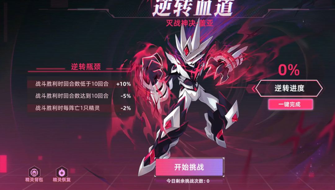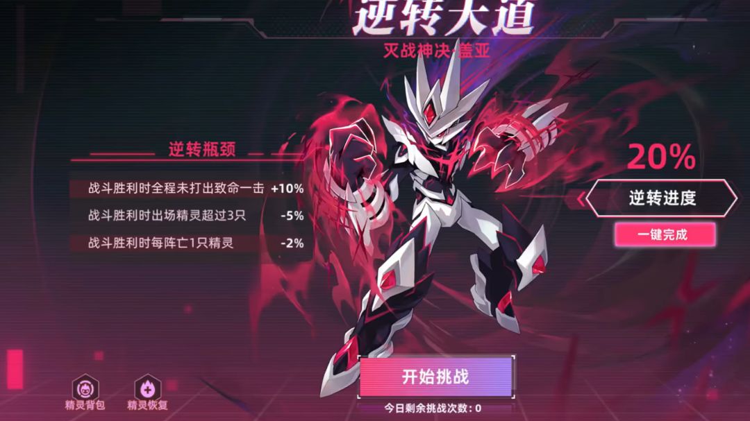 小关1:【逆转天道】(全程无暴击+10%进度;出战精灵超过3只-5%进度;每阵亡一只精灵-2%进度)