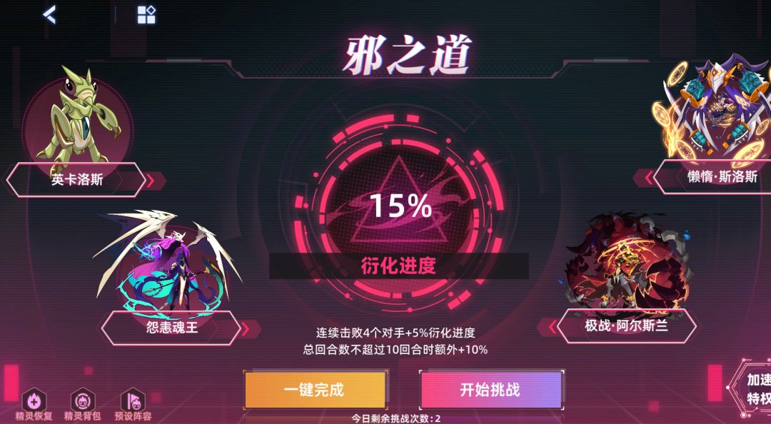 小关3:【邪之道】(连续击败4个boss+5%进度;击败4个总回合不超过10回合+10%进度)