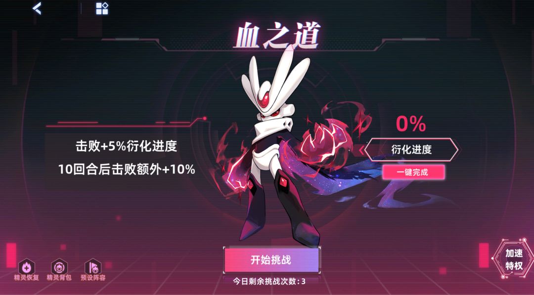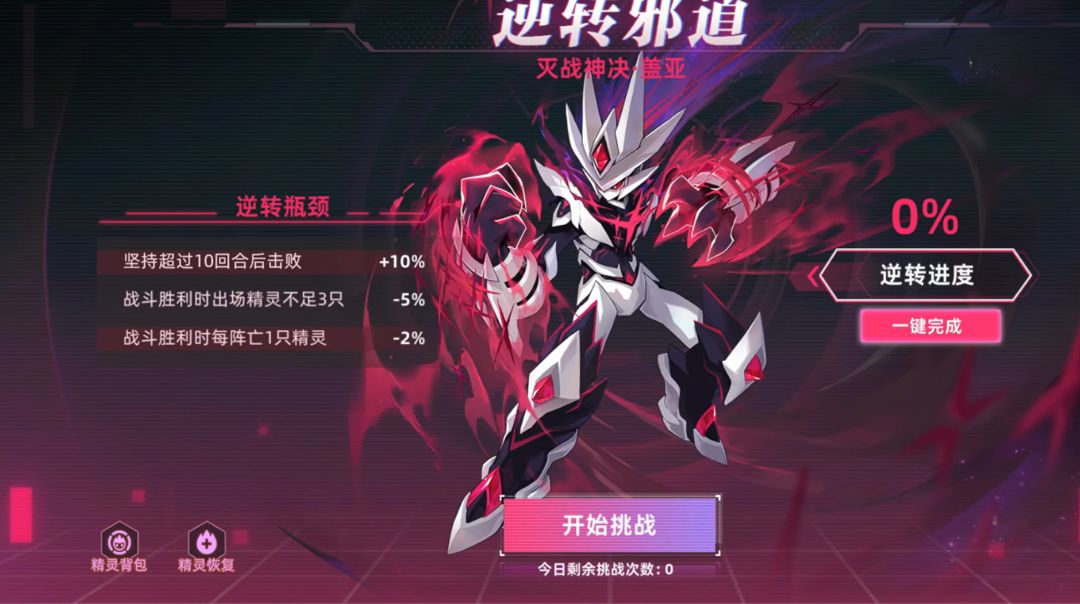小关3【逆转邪道】(坚持超过10回合后击败+10%进度;出战精灵不足3只-5%进度;每阵亡一只精灵-2%进度)