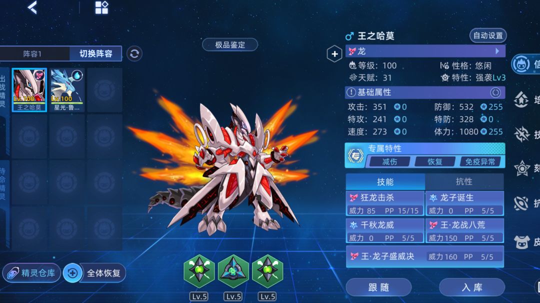 打法(金火):王之哈莫(特防体+2个减伤柱)与千裳(特防体+2个减伤珠)互切叠满登场次数(boss有强化时不切千裳,而使用王哈消强后再切),然后上王之哈莫完成暴击与使用属性技能次数。