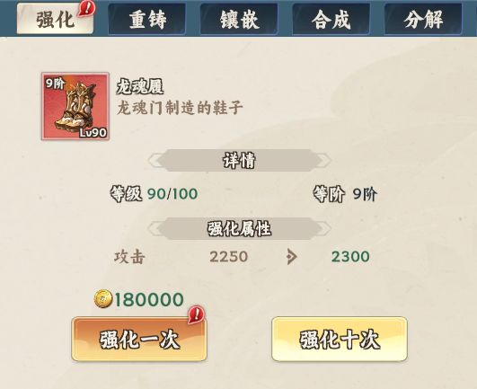 装备品质达到仙品可以进行重铸升级,三个相同仙品装备可以合成一个神品装备。