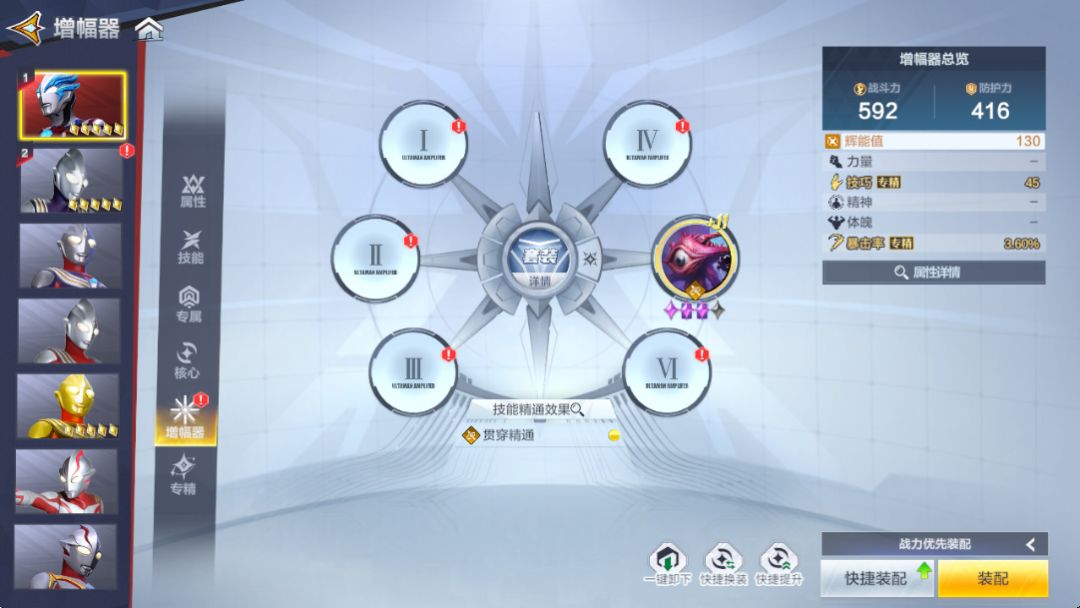 但是增幅器有6个位置,所以我们通常会根据不同奥特曼的技能搭配不同的技能精通等级,通常为一个4级精通搭配一个2级精通,如布莱泽的技能精通属性切割精通居多,然后1技能的输出要高于普攻,那么搭配的技能精通等级为4级切割加2级贯穿,如果是喜欢普攻输出的话可以把2级贯穿换成2级物理。(增幅器提供的精通属性时可以转化为其他属性的)