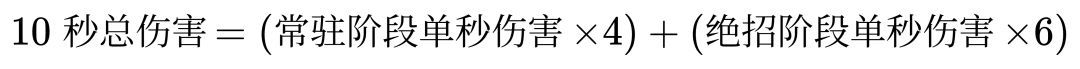 假设10秒输出场景(10秒常驻buff+6秒绝招加成),后六秒生效,即有4秒绝招真空期,至少对应实战中40%的弓箭手与幻刺绝招真空(保守估计),得到10秒输出期望模型: