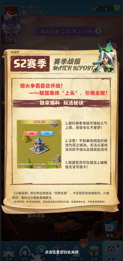每天0点或者当日进入赛季主界面后,展示前一天战况信息的赛季战报信息(赛季第一天除外),联盟没有报名熔火争霸玩法则不显示战报。赛季战报将会为旅行者们带来更多有效信息,胜利尽在掌握!