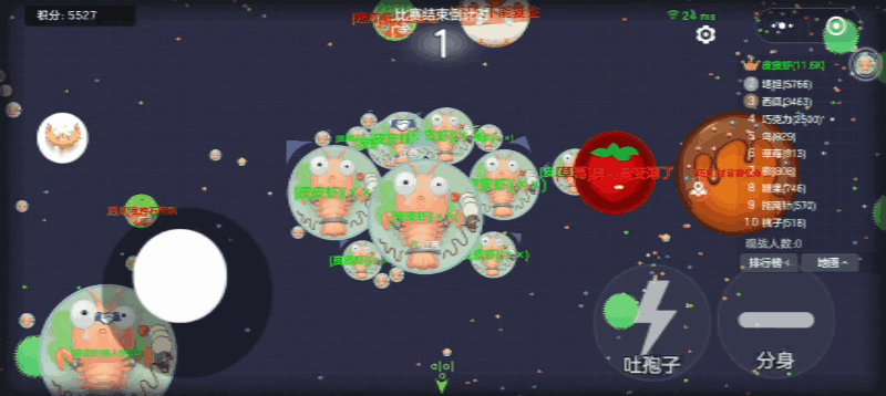 实战中若遭遇单独敌人(如 “指南针” 皮肤对手),可运用 “定点吐球” 技巧:将摇杆拉至目标位置精准吐球(注意不超过黑色虚拟区域),实现集中攻击,高效压制对手。