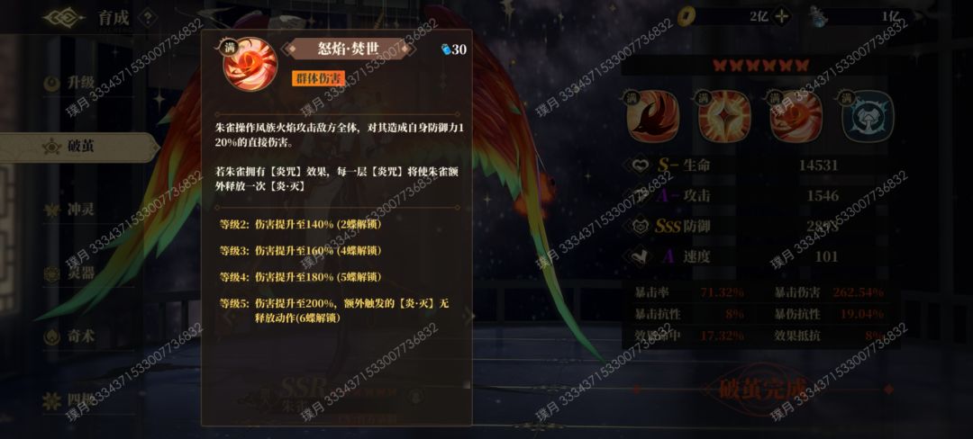 【朱雀专属】造成直接伤害时,有30% (+效果命中)的概率附着1层灼烧效果,持续2回合