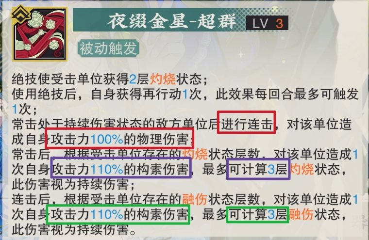 她的伤害构成比较杂,常击120+连击100+灼烧层数×90/110+融伤层数×90/110
