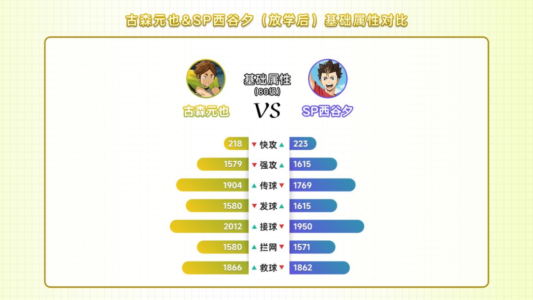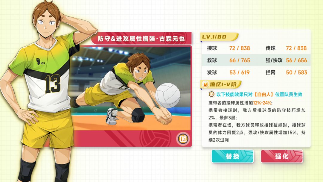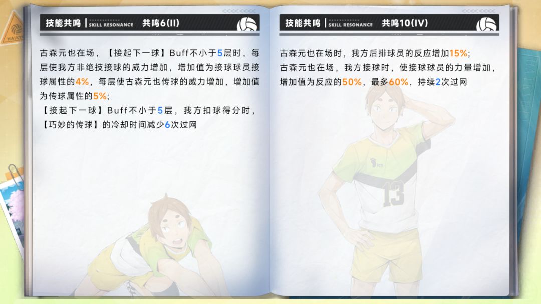 佐久早圣臣的强攻属性增加20%;古森元也的接球属性增加20%;我方球员接球的威力增加,增加值为接球属性的20%