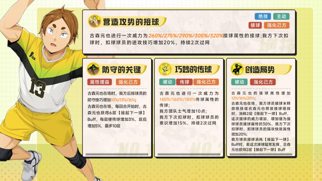 古森元也在场,我方球员接球未释放绝技或古森元也释放接球绝技时,消耗2层【接起下一球】Buff,这次接球的威力增加,增加值为接球球员接球属性的30%,我方下次扣球时,扣球球员的强攻快攻属性增加20%;