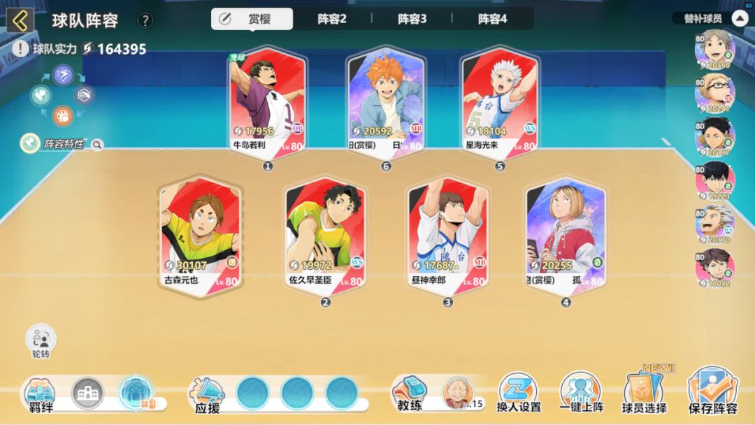 推荐进入赏樱队,SKS+古森与赏樱队非常契合。研磨+翔阳,有15层【固若金汤】BUFF后全体22.5%反应加成,让翔阳、星海、SKS接球球球超常发挥不再是梦。OP位上什么球员都行,最难受的点可能就是自由人的替换,目前最好替换OP位,进攻站位就这么站,防守翔阳1号位。