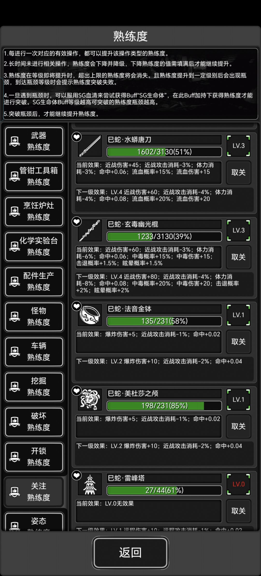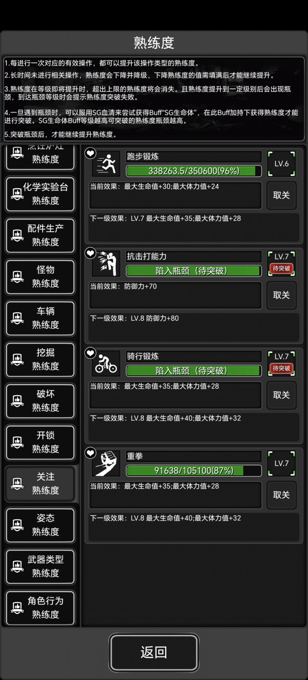 ),动感单车(说实话很繁琐,用吃喝换熟练度)抗打击熟练度的获取方式;重拳熟练度获取得时候自然流有了,如果想快些毕业可以参考特姬任务里哨戒炮特别多的地图