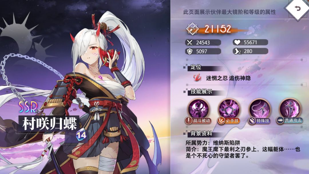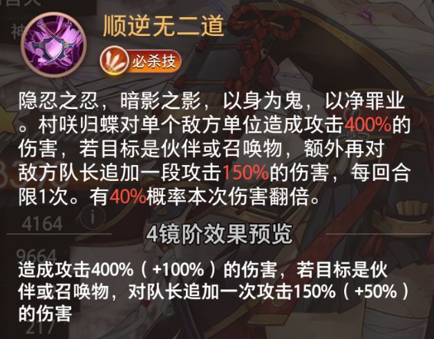 隐忍之忍,暗影之影,以身为鬼,以净罪业。村咲归蝶对单个敌方单位造成攻击400%的伤害,若目标是伙伴或召唤物,额外再对敌方队长追加一段攻击150%的伤害,每回合限1次。有40%概率本次伤害翻倍。