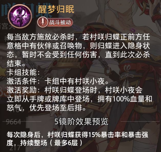 每次隐身后,村咲归蝶获得15%暴击率和暴击强度,持续整场(最多6层)