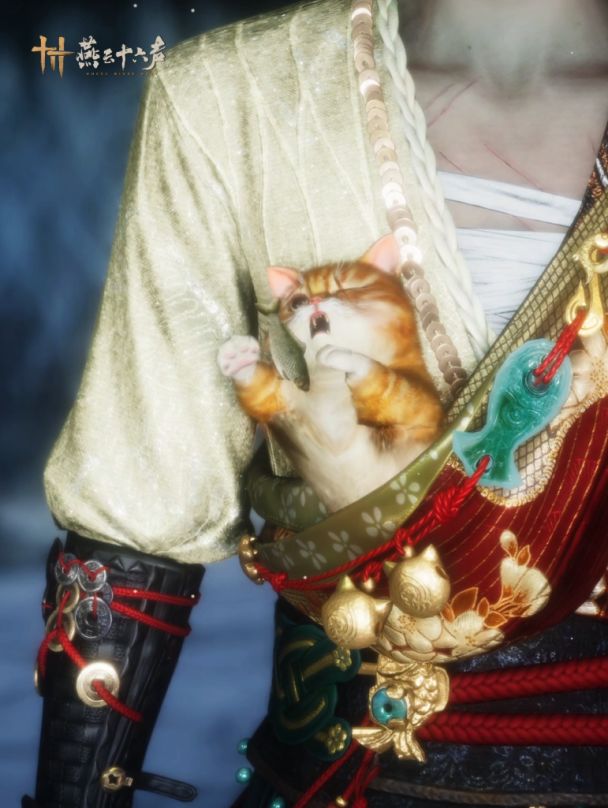 在本次套装设计中,我们首次尝试了包含动物在内的配饰动态效果。待机状态下,小猫将有特殊的动态表现。时而浅眠静卧,时而嬉闹攀肩,为江湖旅程更添生趣。该配饰也可与其他服装自由搭配,相伴随心!