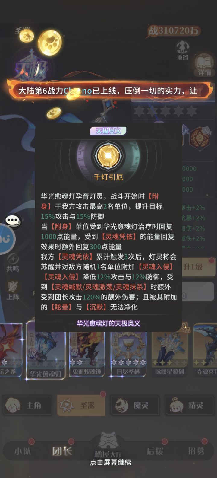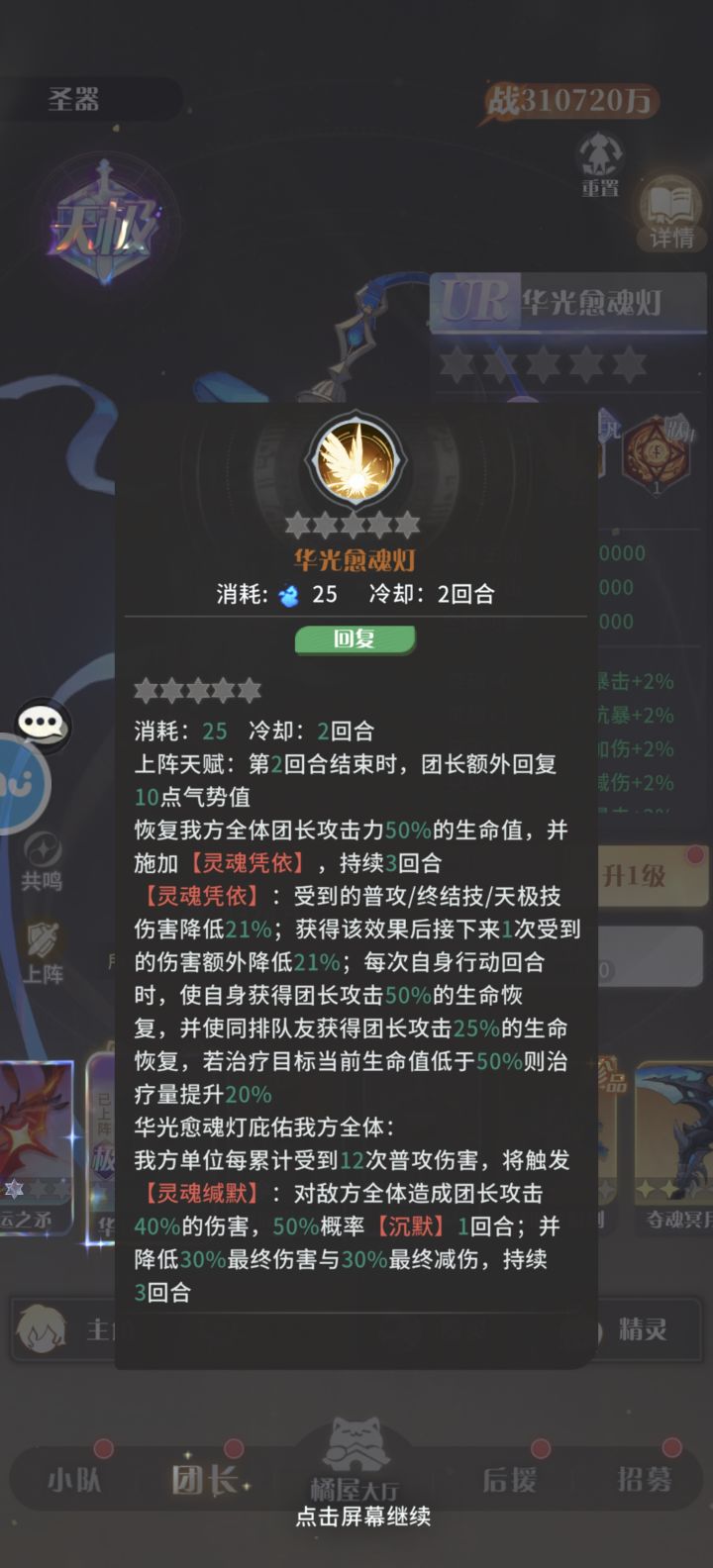另一个灵魂凭依的回能,不到UR1根本不生效,所以拿白板还不如圣杯和琴,琴还能回三个人的能量,虽然不多,但至少是针对能量最少的回能,不会浪费,而且还可以复活,还有驱散,圣杯也是有驱散增伤减伤,就这b天极圣器啥增幅没有,几个buff还要十几次普攻终结技才触发,12次普攻,最少也要四回合才触发两次,18个终结技就更不想说了,哪怕是古域一回合现在的环境也很难放出10 次,至少三回合才有效果,纯逆天