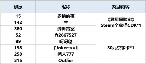 本次活动已开奖,恭喜以下小伙伴获得奖励~【已开奖】挖穿地心,重塑群星!《异星探险家》现已开启预约!