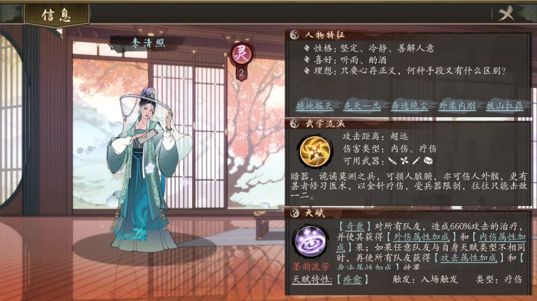 李清照的天赋可增强主力输出侠客的伤害,配合痊愈效果为持续输出提供稳定环境,配合鱼玄机的【拯救】合理运用可将痊愈时间延长至10秒。