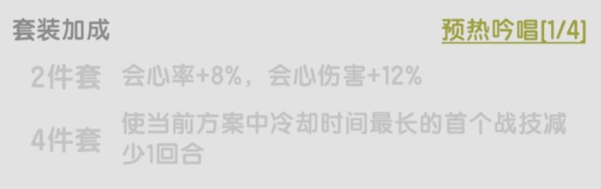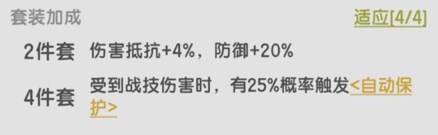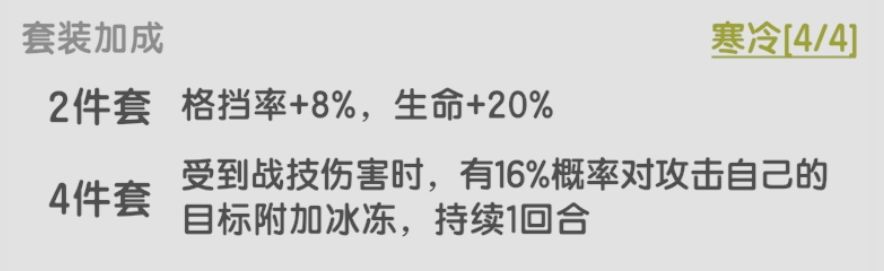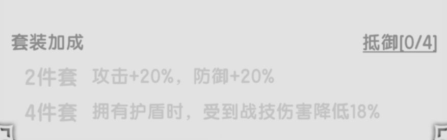 适合高格挡高减伤的职业,如果坚持的回合充足那它循环触发的盾量会非常可观,不错的套装,比不屈上限高。