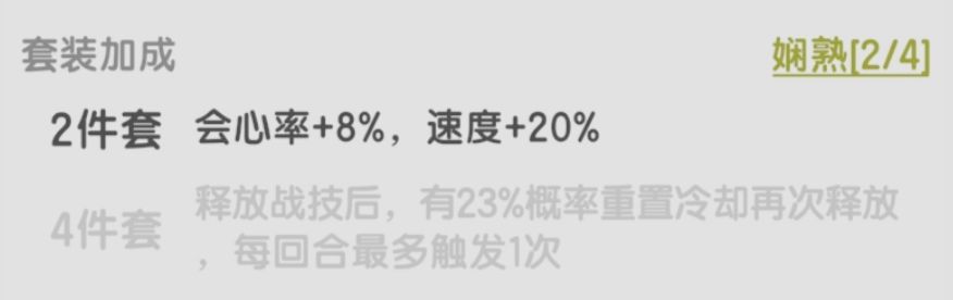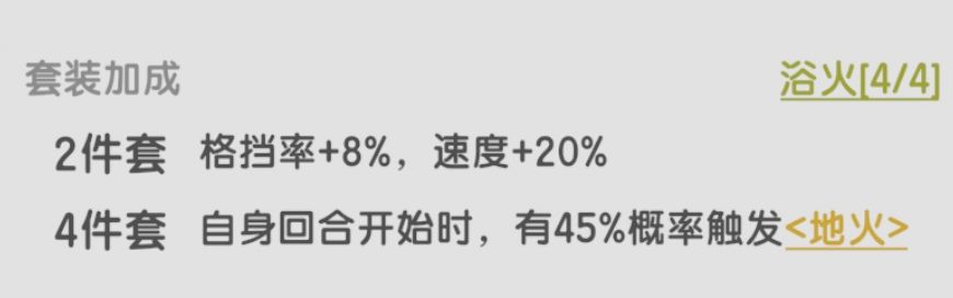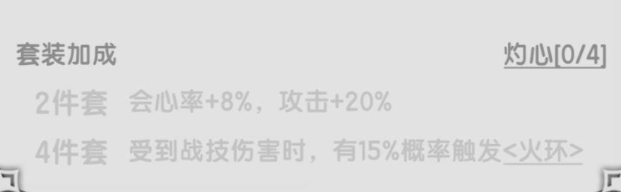 由于伤害低,触发率不高,该套装效果也不是很必要。爬塔凹图有追求可以考虑,毕竟效果触发的火环是aoe,凹一下触发实战表现其实还行。过渡套,别纠结。