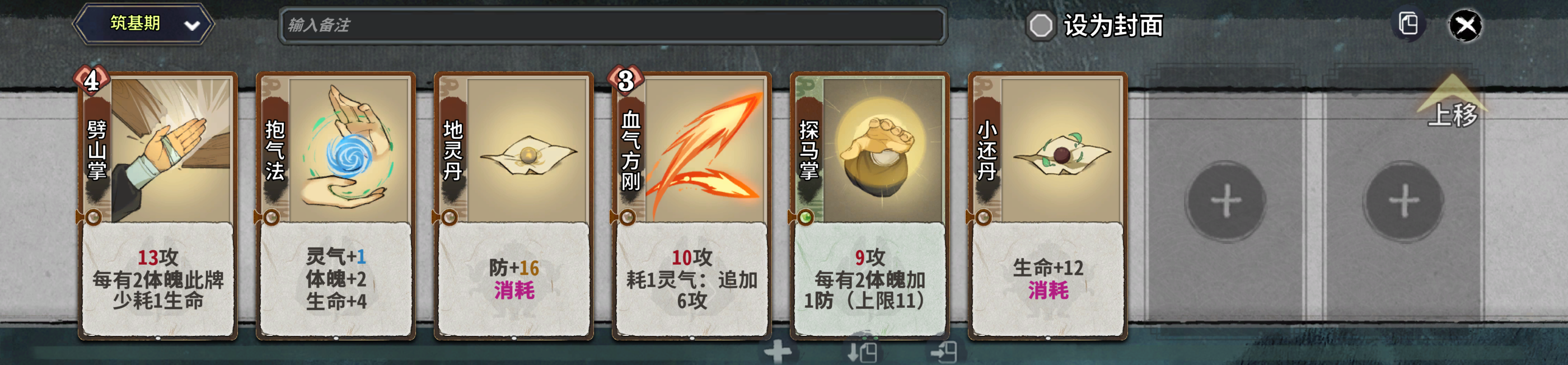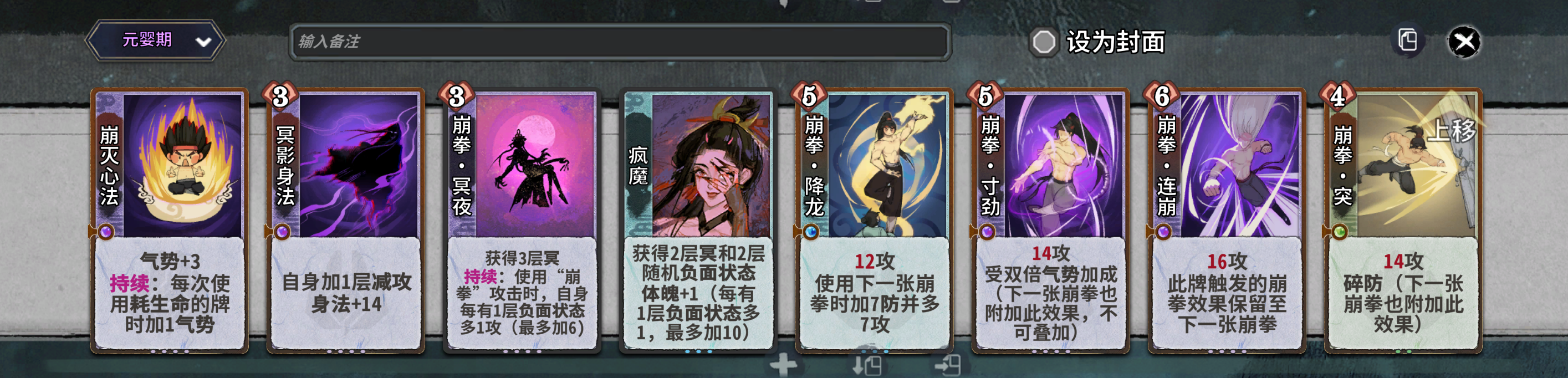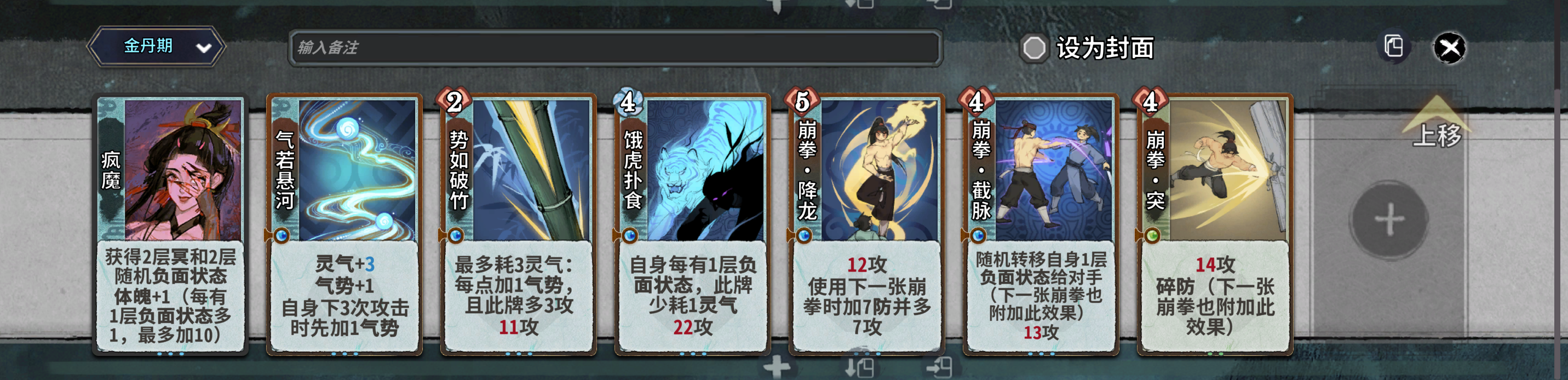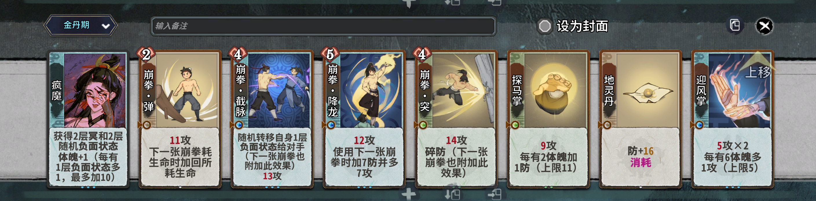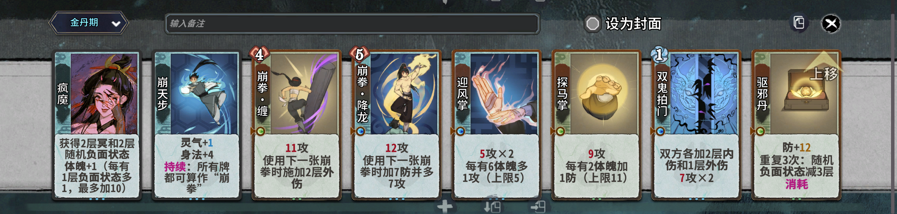 经典崩天+降龙+迎风/双鬼,后置可以截脉或者驱邪丹,或者防御类卡牌,保证一第二圈