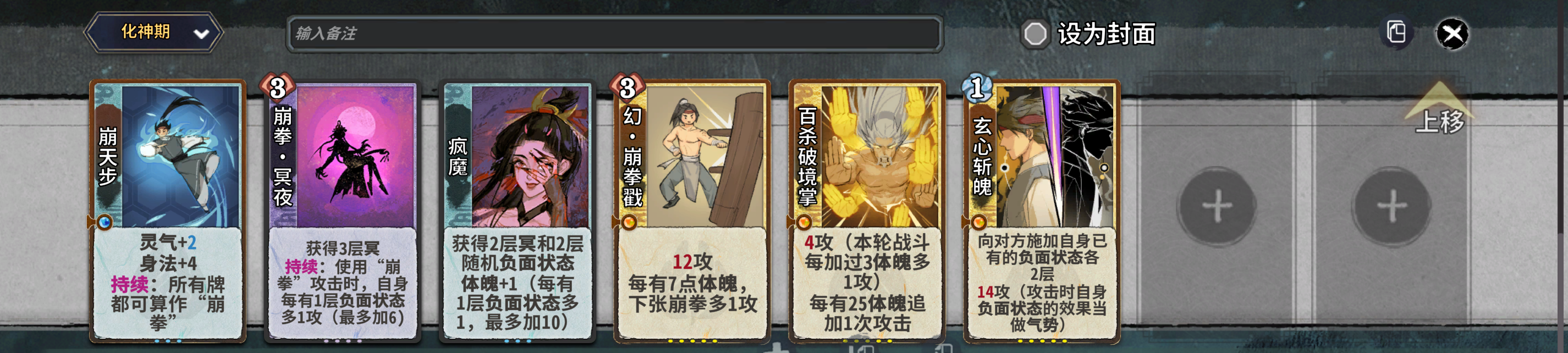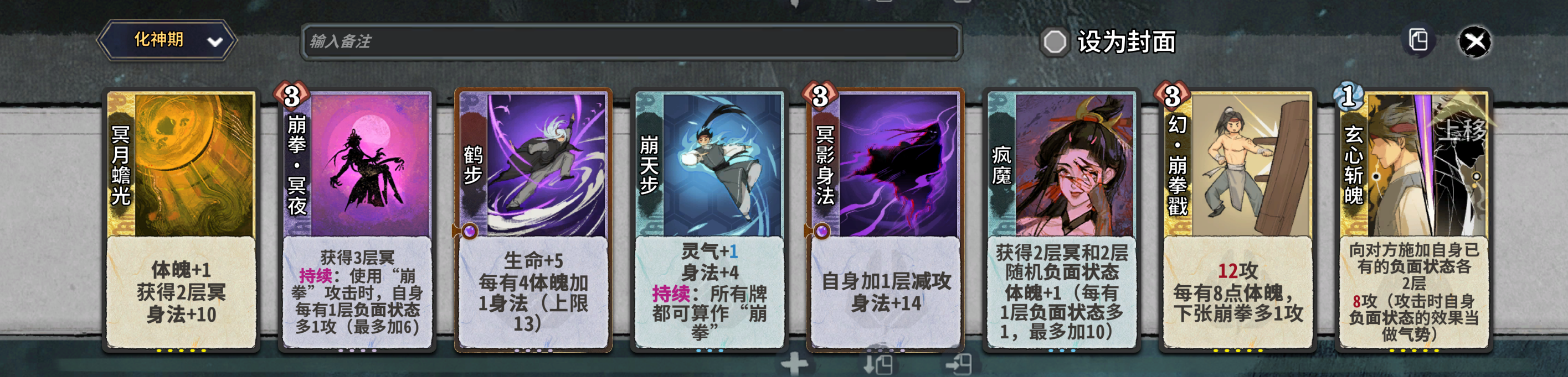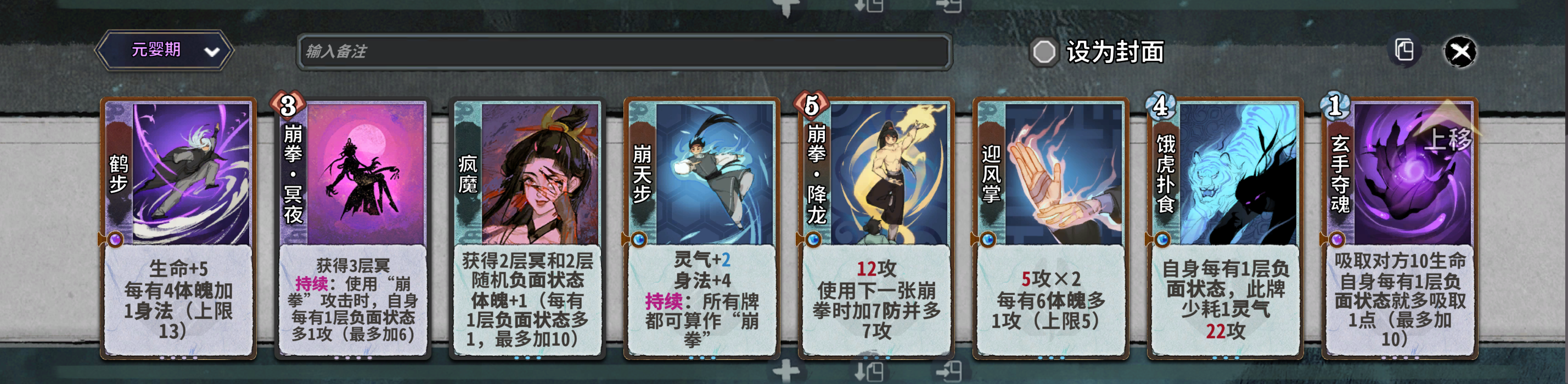 这时候就需要一张非常强力的替代卡,那就是玄心斩魄,而且好多时候有奇效。这里需要注意元婴最好留一张二级冥影来代替闪击,这样我们不上冥月蟾光,上鹤步、冥影、崩天步,刚好可以三十身法,方便我们多出一张伤害牌或防御牌。