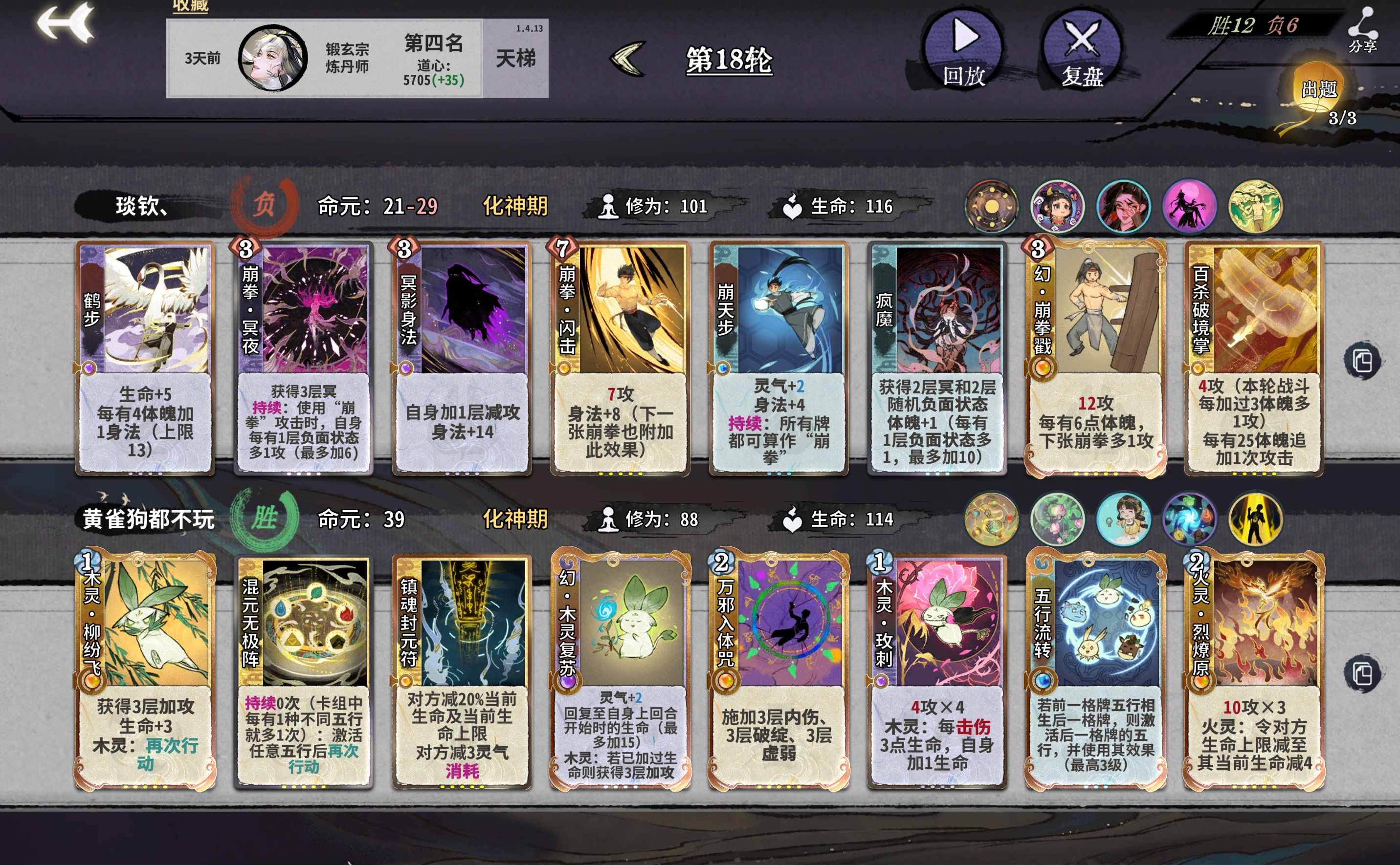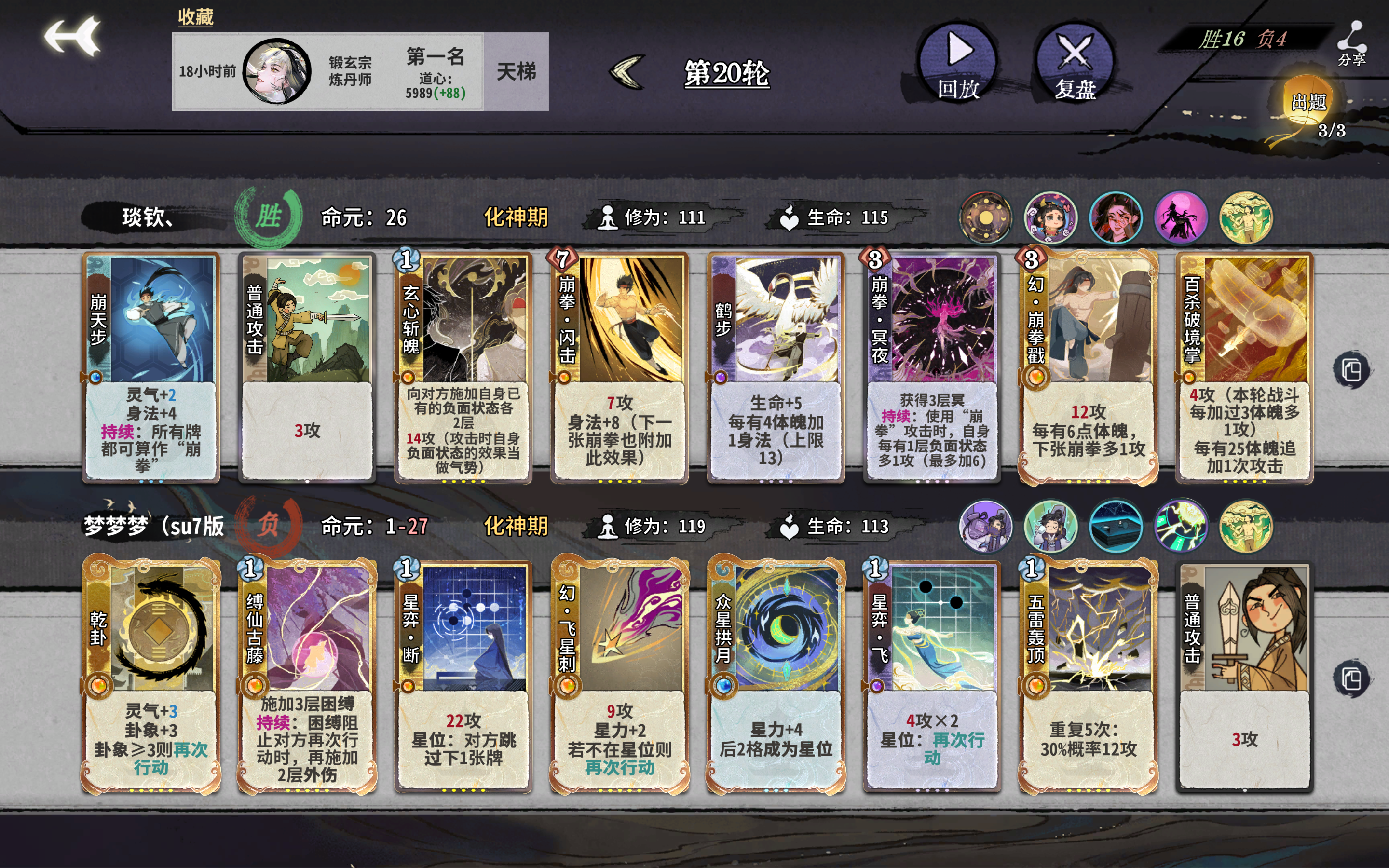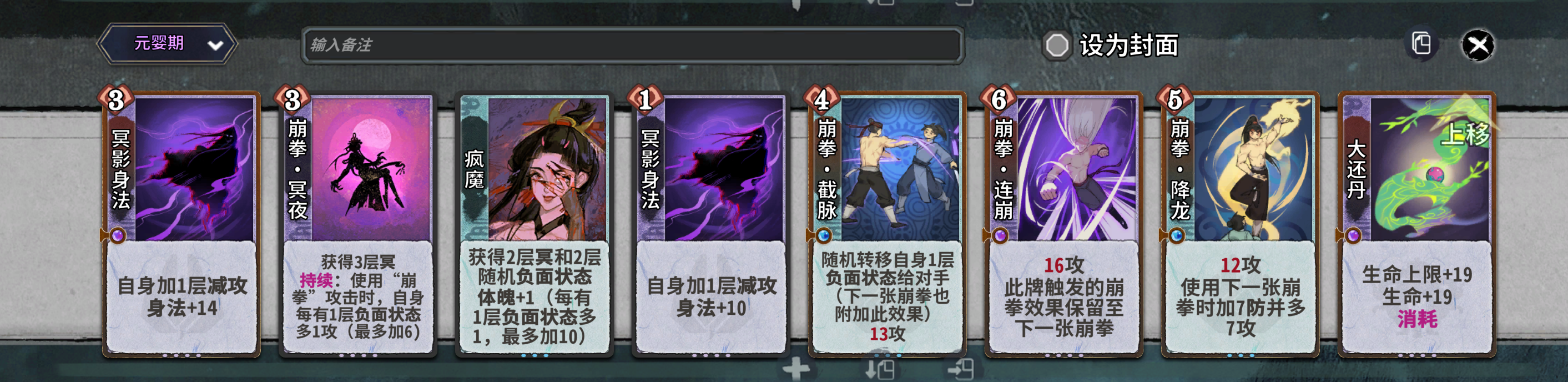 这时候就需要一张非常强力的替代卡,那就是玄心斩魄,而且好多时候有奇效。这里需要注意元婴最好留一张二级冥影来代替闪击,这样我们不上冥月蟾光,上鹤步、冥影、崩天步,刚好可以三十身法,方便我们多出一张伤害牌或防御牌。