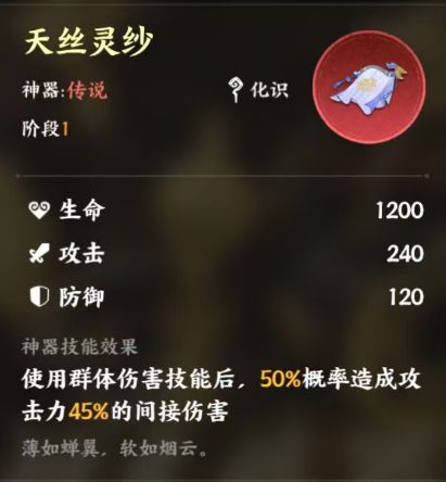 3)羲和不会暴击,所以神器选择比较有限,首先排除赤焰日轮、建木和五火此类提升暴击率的,建议选择白玉弯刀或者满星天丝灵纱。